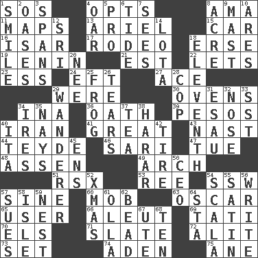 ACROSS 1. Distress signal 4. Chooses 8. Wet nurse (var.) 11. Atlas contents 13. Satellite of Uranus 15. 4-wheeled motor vehicle 16. Austrian river, tributary to the Danube 17. Cowboy competition 18. Celtic language 19. Soviet premier 1918-24 21. Eastern Standard Time (abbr.) 22. Allows 23. Curvy letter 24. Bank Draft (abbr.) 27. Adept person 29. Past tense of be (plural) 30. Baking chambers 34. _ tizzy (2 wds.) 36. Pledge 39. Mexican monetary units 40. SW Asia republic 41. Relatively large 43. Political cartoonist Thomas 44. Miss Universe 1986, Barbara Palacios _ 46. Indian skirt 47. Third day of the wk. 48. NE Netherlands city 49. Bowlike part 51. Acura sports coupe 53. To riddle 54. Compass dir. 57. Trig term 60. Disorderly crowd 63. Witty Wilde 65. One who uses or employs something 66. Eskimo relative 69. Jacques of French films 70. Raised railways 71. Schedule 72. Set down 73. Put into a specified state 74. An important port of Yemen 75. A saturated hydrocarbon DOWN 1. Grin 2. Fertile tracts in a desert 3. Connects, as a bridge 4. Rowing implement 5. Adept person 6. Event that recurs at intervals 7. Observes 8. 1/640 square mile 9. Vertical spar for supporting sails 10. Ancient Greek god of war 12. Indian title of respect (Mr.) 14. Globular water bottle used in Asia 18. Veterans Day date 20. Born 25. Tree-dwelling hopper 26. Pulls into pieces 28. Police officer (slang) 29. Roamer 31. He sold his birthright 32. Olfactory organ 33. Fast jet (abbr.) 34. Angers 35. Negative votes 37. Afternoon social gathering 38. Ethiopian city, capital of Harari 40. Call ___ day 42. Hoop that covers a wheel 45. Followers of ems 50. Corporate head (abbr.) 52. Dec. holiday 54. Any of the three canals of the cochlea 55. Smooth fabric 56. Compose 57. Takes to court 58. Capri or Wright 59. Egg locale 61. Water jar 62. Necklace unit 64. R.R. building 67. Shoshoni 68. "___ Little Indians"