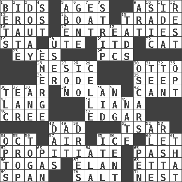 ACROSS 1. Auction offers 5. Eras 9. SW Saudi Arabia district 13. Greek god of love 14. Water vessel 15. Barter 16. Tense 17. Pleas 19. R.R. building 20. Shoshoni 21. It would 22. Domesticated feline 23. Snake ____ (dice throw) 25. Personal Computers (abbr.) 26. Of or pertaining to a meson 30. Von Bismarck 34. Wear away 35. Ooze 36. Lacerate 39. Pitcher Ryan 42. Patter 43. Long (Scottish) 44. Woody, climbing, usually tropical plant 46. Algonquian 47. _ Allan Poe 48. June honoree 51. Russian ruler of old 54. Sep. follower 57. Atmosphere 58. Frozen water 60. Allow 62. Conciliate 65. Romantic infatuation 66. Ancient Roman robes 67. Style 68. Singer James 69. Connect, as a bridge 70. Table seasoning 71. Egg locale DOWN 1. Wagers 2. Feeling or showing extreme anger 3. A city in N France, SE of Calais 4. Fast jet (abbr.) 5. Collude with 6. Went 7. Consume 8. Remove all contents or possession from 9. Tate display 10. Ketch in the Levant 11. The content of cognition 12. Remainder 15. Small amounts or degrees 18. And so on (abbr.) 20. One who makes use of a thing 24. Develop 27. Male offspring 28. Wedding promise 29. Cell (Danish) 30. Motion picture awards 31. Beverage made from leaves 32. "___ Little Indians" 33. Elect 36. Affectionate concern, for short 37. Hearing organ 38. One (Scot) 40. Assist 41. Tired old horse 45. Nathan's nickname 48. Raised platform 49. Small island 50. Frees from moisture 52. Having winglike extensions 53. Musical pauses 54. Chooses 55. Riding implement 56. Ancient Roman robe 58. Slanted text style (abbr.) 59. Penny 61. Not this but _ 63. Baking dish 64. Insect wing 65. Writing instrument