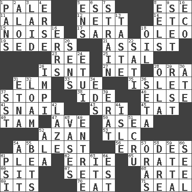 ACROSS 1. Light colored 5. Curvy letter 8. Compass dir. 11. Having or resembling wings 12. Remaining after all deductions 14. And so on (abbr.) 15. Annoying sound 17. "Two Mules for Sister ____" 18. Butter sub 19. Spring feasts 21. Aid 23. Portuguese money of account (variant) 25. Slanted text style (abbr.) 26. Is not 27. Fish or hair follower 28. Mouth or opening 31. Shade tree 33. Take to court 35. Small island 37. Obstruct or block passage 38. Binary compound 40. Otherwise 41. Slow-paced one 43. Indian title of respect (Mr.) 45. Make lace 46. Scottish cap 47. "___ Maria" 50. At sea 52. Muslim summons to prayer 53. Affectionate concern, for short 54. Most capable 56. Eats (away) 61. Entreaty 62. 4th largest of the Great Lakes 65. A salt of uric acid 66. Be seated 67. Arranges properly for use 68. Johnson of "Laugh-In" 69. It is 70. Ingest 71. Lick closed DOWN 1. Baking dishes 2. _ vera 3. Put down 4. Celtic language 5. Followers of ems 6. Ocean 7. Put through a sieve 8. Snakelike fish 9. Proofreading order 10. Environmental prefix 13. Clothes sense 16. Blunders 18. Petroleum 20. Elected reps. 22. Suttee (variant) 24. Needle case 26. Body of Kaffir warriors 28. Water jar 29. Take ten 30. Had dinner 31. Inactive volcano in Sicily 32. Rich soil 34. Begley and Asner 36. Bristle 37. Fast jet (abbr.) 39. Part of Q.E.F. 42. Goldbrick 44. Small island 48. Flower holders 49. Main course 51. Shade of tan 52. Insect wing 54. Set down 55. Wagers 57. Mouths or openings 58. Have the gumption 59. Singer James 60. Stitch closed the eyes of (a falcon) 61. 23rd letter of the Greek alphabet 63. Call ___ day 64. Eastern Standard Time (abbr.)