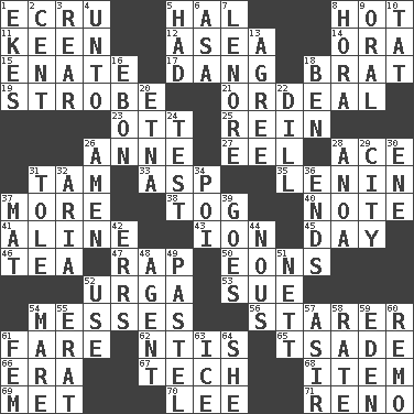 ACROSS 1. Shade of tan 5. Actor Linden 8. Being at a high temperature 11. Peachy ____! 12. Toward the sea 14. Mouth or opening 15. Maternal 17. Mild oath, euphamism for damn 18. Naughty child 19. Disco prop 21. Severe or trying experience 23. Baseball player Mel 25. It's straight from the horse's mouth 26. Queen of England 1702-14 27. Snakelike fish 28. Adept person 31. Scottish cap 33. Viper 35. Soviet premier 1918-24 37. Greater amount 38. Coat; cloak 40. Observe 41. Place in a line 43. Electrically charged atom 45. 24 hours 46. Afternoon social gathering 47. Hit sharply and swiftly 50. Immeasurably long periods of time 52. Capital and largest city of Mongolia 53. Institute legal proceedings 54. Makes clutter 56. A viewer who gazes fixedly 61. Conductor's collection 62. Nuclear Threat Initiatives 65. Sadhe (variant) 66. Epoch 67. Technician 68. A whole individual unit 69. Was introduced to 70. Area sheltered from the wind 71. Western Nevada city DOWN 1. Supplements with great effort 2. Penny 3. Buttocks 4. To (old English) 5. Possessed 6. White ___ sheet 7. Poe poem 8. Israeli folk dance 9. Taken by mouth 10. Make lace 13. Match 16. Inky black, to poets 18. Benjamin's nick name 20. Inactive volcano in Sicily 22. Deli pickle 24. Trial 26. So be it 28. Small Philippine buffalo 29. Municipality 30. Compass dir. 31. Lacquered or enameled metalware 32. Operatic vocal solo 34. Luau course 36. Conclusions 37. Floor covering 39. Leaves 42. Blunders 44. Good sense 48. Rep 49. Soft color 51. Remaining after all deductions 52. Purpose 54. Female horse 55. Part of Q.E.F. 57. SW Saudi Arabia district 58. Pace 59. Paradise 60. San ____ (Riviera town) 61. Opposite of masc. 63. Frozen water 64. A female animal or person