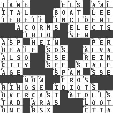 ACROSS 1. Docile 5. Raised railways 8. Leather borer 11. Slanted text style (abbr.) 12. Water vessel 13. Area sheltered from the wind 14. Cylindrical with tapered ends 17. Event 19. Oak nuts 21. Opts 22. Musical group of three 23. Elected rep. 24. Viper 27. Count _ (2 wds.) 29. For each 32. Memphis, Tenn. Street 34. Distress signal 36. Inventor's middle name 37. In addition 38. Compass dir. 39. It's straight from the horse's mouth 40. Municipality 41. Perceive with the eye 42. Lacking originality or spontaneity 43. Personal question 44. Connect, as a bridge 46. Compass dir. 47. At this time 50. Greek god of love 52. Full of chinks, cracks, or crevices 55. Foolish or stupid persons 57. Cloudy 59. Ringlike coral islands and reefs 62. Bit 63. Ancient river in northeast Turkey 64. Plunder 65. Single 66. Acura sports coupe 67. Singer James DOWN 1. Teat (slang) 2. Had dinner 3. Hindu Mythology: god of death 4. Voters do this 5. Period of immesurable duration 6. Shoestrings 7. Vertical member of a panel or frame 8. Actor Baldwin 9. Left 10. Allows 12. Altar cloth linen 15. Singer Mel 16. One of the Great Lakes 18. Lair 20. Annoying sounds 24. Phillipine bananalike plant 25. Former Milwaukee Brewers owner Bud 26. Thick mixture 28. Olfactory organs 29. Entreaties 30. Vices 31. Indian princess (variant) 33. Myrna of the movies 35. Oozed 36. Nonscientific branch of learning 42. Snob 45. Operatic vocal solo 47. Or not 48. Motion picture award 49. Erodes 51. Took without asking 52. Printing process, for short 53. "Terrible" tsar 54. Ancient Persian 55. ___ a Wonderful Life 56. Position in a hierarchy or organization 58. Saxophone 60. Car dealer's back yard 61. R.R. building