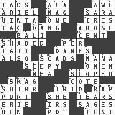 ACROSS 1. Small boys 5. According to 8. Deep reverence 11. Satellite of Uranus 13. Tired old horse 14. "Two Mules for Sister ____" 15. National forest in Provo, Utah 16. Single 17. Angers 18. Label 19. Mild oath, euphamism for damn 21. Came up 22. Indonesian resort city 24. Penny 25. Cast a shadow over 27. For each 29. Jacques of French films 30. Natives or inhabitants of Denmark 32. In addition 33. Tons 35. Grandmother 39. Oozy 41. Sign of things to come 42. Teachers' org. 43. Slanted 45. Heroin 48. ____ d'Azur (French Riviera) 49. Bake eggs in their shells 50. Musical group of three 52. Strike 55. Sweet dark-red dessert wine 56. A female animal or person 57. Pulls apart 59. 4th largest of the Great Lakes 60. Big collection agency 61. Gurus 62. Lair 63. Plant holder 64. Trial DOWN 1. Strained 2. Operatic vocal solo 3. Empty-headed or silly people 4. Put into a specified state 5. At once, immediately (arch.) 6. Austrian-born American filmmaker Fritz 7. Personal question 8. Composer Copland 9. Obtain by seizing forcibly or violently 10. Relaxation 12. Dipping utensil 14. Beget 20. Help 21. 1/640 square mile 23. Goodbye (Sp.) 25. R.R. building 26. Actor Linden 27. Writing tablet 28. Followers of ems 30. 24 hours 31. Snout, nose 33. Perceive with the eye 34. Numbers guy (abbr.) 36. Electrical Measurement 37. Born 38. Also 40. Engineer (abbr.) 43. _-fi 44. Plunders 45. Dinah or Pauly 46. Japanese brewing company 47. Johnson of "Laugh-In" 49. Drove too fast 50. Through, poetically 51. Relief 53. Ancient Greek god of war 54. Inconspicuous attention getter 56. Small drink 58. Ingest