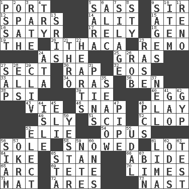 ACROSS 1. Sweet dark-red dessert wine 5. Backtalk 9. Title for a knight 12. Practice fights 14. Came down and settled, as after flight 15. Had dinner 16. Letch 17. Have trust in 18. Commissioned military rank (abbr.) 19. Definite Article 20. New York city 23. San ____ (Riviera town) 24. American tennis player Robert 25. Pate de foie ____ 27. Religious group 30. Strike 32. Greek goddess of the dawn 33. Silent film actress Nazimova 34. Mouths or openings 36. Benjamin's nick name 38. Air pressure measure (abbr.) 39. Neckwear 40. Ovum 43. Compete 46. Fastener 48. Live dramatic performance 49. Roguish 51. _-fi 52. Hoof sound 53. Writer Wiesel 54. Musical composition 56. Not divided or shared with others 58. Frozen precipiation fell 61. Car dealer's back yard 64. Mamie's husband 65. Comedian Laurel of Laurel & Hardy 66. Tolerate 68. Curve 69. False hair 70. Citrus fruits 71. Floor protector 72. Ancient Greek god of war 73. Political cartoonist Thomas DOWN 1. Inconspicuous attention getter 2. Brightly colored fish 3. Assign a rank or rating to 4. Attempt 5. "Two Mules for Sister ____" 6. Actor Baldwin 7. Fodder prepared in a silo 8. Filthy place 9. Gurus 10. A distinct part 11. Former U.S. Attorney General Janet 13. Indian titles of respect 21. Through, poetically 22. Centers of feelings and intuitions 23. To erase 24. _ moment's notice (2 wds.) 26. Director Reiner 27. Plant excrement 28. Raised railways 29. 154 in Roman numerals 31. Aches 35. Manatee 37. 1994 drama film starring Jodie Foster 41. E Mali city 42. Con 44. Capri or Wright 45. Connecticut Ivy Leaguer 47. Corncob 48. Personal Computers (abbr.) 50. Last 53. Choose 55. Hereditary estate 56. Thailand, formerly 57. Gumbo ingredient 59. Nathan's nickname 60. Washington bills 61. Pale green bean 62. Lyric poems 63. Trial 65. R.R. building 67. Storage container