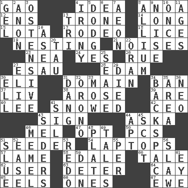 ACROSS 1. E Mali city 4. The content of cognition 8. Small Philippine buffalo 12. Followers of ems 13. Marketplace scale 14. Yearn 15. Globular water bottle used in Asia 17. Cowboy competition 18. Louse (plural) 19. Snuggling 21. Annoying sounds 23. Teachers' org. 24. Affirmative reply 26. Regret 27. Son of Isaac 28. Dutch treat 30. Connecticut Ivy Leaguer 31. Kingdom 34. Bar 37. 54 in ancient Rome 38. Came up 39. "We ___ not amused" (Victoria) 40. Area sheltered from the wind 41. Overwhelmed 42. Corporate head (abbr.) 43. Public display of a written message 44. "____ silly question..." 46. Cartoonist voice _ Blanc 47. Elect 50. Personal Computers (abbr.) 51. Sowing specialist 54. Portable computers 57. Unable to walk 58. Peak District village in England 60. Lie 62. One who makes use of a thing 63. Prevent from occurring 64. Island 65. Snakelike fish 66. Washington bills 67. She-sheep DOWN 1. Set 2. Soon (poet.) 3. Clearly or manifestly demonstrative 4. Literary sarcasm 5. Evade 6. Compass dir. 7. A really long time 8. Plant genus of onion and garlic 9. Annoying sound 10. At one time in the past 11. Matures 13. Three (prefix) 16. Toward the sea 20. The 19th letter of the Greek alphabet 22. NW Algerian seaport 25. Gospel singer Marvin 27. Writer Wiesel 29. Passed on 30. Pipe bend 31. Mild oath, euphamism for damn 32. U. of Maine site 33. Cut the grass 34. Keyboard key 35. Type of rug 36. Modern: prefix 41. Drop; flow; fall 43. Spring feasts 44. Fitting 45. Highlander 46. Klaipeda city 48. Food holder 49. Lies 51. Change direction abruptly 52. Relaxation 53. Do over again 55. For each 56. Cole _ (cabbage dish) 59. Lair 61. Sight organ