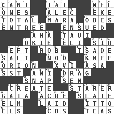 ACROSS 1. Patter 5. Make lace 8. Cartoonist voice _ Blanc 11. Singles 12. Actor Baldwin 14. Make supply last 15. "_____ Recall" 17. Hindu Mythology: god of death 18. Lyric poems 19. Main course 21. Took place subsequently 23. Housemaid (var.) 25. "Change" in Tahitian 26. Migrant worker of the '30s 27. Biblical high priest 28. Title for a knight 31. Bank Draft (abbr.) 33. Director Reiner 35. Sadhe (variant) 37. Table seasoning 38. Lower and raise head in agreement 40. Leg joint 41. Greek mythologigal hunter 43. 16 45. White ___ sheet 46. Fast jet (abbr.) 47. Cuckoo 50. To be drawn or hauled along 52. Fastener 53. Elected rep. 54. Cause to be 56. A viewer who gazes fixedly 61. Greek goddess of the earth (variant) 62. 43,560 square feet 65. Schedule 66. Shade tree 67. Put down 68. "Tell ____ the Marines!" 69. Raised railways 70. Music discs 71. Afternoon social gatherings DOWN 1. ____ d'Azur (French Riviera) 2. At once, immediately (arch.) 3. Remaining after all deductions 4. Russian ruler of old 5. Scottish cap 6. In the manner of 7. Cylindrical with tapered ends 8. Ancient Persian 9. Supplemented with great effort 10. French article 13. Lessep's creation 16. Path through which fluid escapes 18. Fr. "Yes" 20. Independent ruler or chieftain 22. Set of matching outer garments 24. Period of immesurable duration 26. Von Bismarck 28. Without 29. It may be bright or harebrained 30. To riddle 31. Hearing organs 32. Secret move to avoid paying debts 34. Gift holder 36. Heroin 37. Mayday 39. Movie discs 42. Grandmother 44. Angers 48. Relating to or accompanying birth 49. Medicinal drug used to evoke vomiting 51. Pismires 52. Ocean 54. Give a ring to 55. Basketball hoops 57. Set down 58. Assign a rank or rating to 59. Singer James 60. Vintage cars 61. Unit of force equal to gravity 63. To free from 64. Begley and Asner