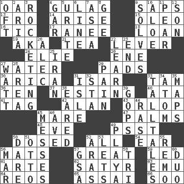 ACROSS 1. Rowing implement 4. POW camp 9. Plant excrements 13. Back 14. Get up 15. Butter sub 16. Nervous spasm 17. The wife of a rajah (variant) 18. Grant temporary use of 19. Alias (abbr.) 21. Beverage made from leaves 22. Prying instrument 24. Writer Wiesel 26. Compass dir. 27. Wetness 29. Groovy apts. 30. N. Chile seaport 31. Austrian river, tributary to the Danube 33. Scottish cap 36. "___ Little Indians" 37. Snuggling 40. _ moment's notice (2 wds.) 41. Label 42. ____ Jay Lerner 43. Fourth or lowest deck 45. Female horse 47. Insides of hands 48. First lady 49. Inconspicuous attention getter 50. Administered medicine 52. Everything 54. Ewer handle 56. Floor coverings 57. Relatively large 59. Directed 61. Johnson of "Laugh-In" 62. Man with strong sexual desires 63. Australian flightless bird 64. Vintage cars 65. Slender Brazilian palm 66. "Barney Miller" actor Jack DOWN 1. Often (poetically) 2. Operatic vocal solo 3. Shooting up abruptly 4. Slender fish 5. A salt of uric acid 6. Actor's bit 7. Toward the sea 8. Turn to the right 9. Finds the solution 10. _ vera 11. Lightbulb-shaped fruit 12. Male child 20. Actor Baldwin 22. Acquire or gain knowledge or skills 23. Conclusion 25. SW Asia republic 27. Electrical Unit 28. Length times width 29. Ache 31. Capri or Wright 32. R.R. building 33. Baron Munchausen's specialties 34. Tiny particle 35. Atlas contents 38. Having ears or earlike features 39. Republicans 44. To erase 45. Makes clutter 46. "___ Maria" 49. Beach, in Buenos Aires 50. Have the gumption 51. "Beetle Bailey" pooch 52. Caspian sea tributary 53. Allows 55. San ____ (Riviera town) 56. Third mo. 57. Girls' org. (abbr.) 58. Three (prefix) 60. Superhero pair