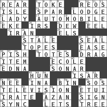 ACROSS 1. Stern 5. Puff or smoke 9. Vintage cars 13. Small island 14. Practice fight 15. Inn 16. Kenny Rogers chart-topper in '80 17. Form of transportation 19. Supplement with great effort 20. Big collection agency 21. Morning condensation 22. Snakelike fish 23. SW Asia republic 25. Raised railways 26. Lacking originality or spontaneity 30. Lick closed 34. Drinks excessively 35. Comfort 36. Expression of disdain 39. Hauls 42. To draw with force 43. A whole individual unit 44. Learning spot: Fr. 46. Pulitzer Prize-winning author Ferber 47. Echolocation 48. Attila the _ 51. Austrian river, tributary to the Danube 54. Born 57. _ tizzy (2 wds.) 58. Storage container 60. Distress signal 62. Household entertainment appliance 65. Needle holder 66. Feeling or showing extreme anger 67. Muslim summons to prayer 68. Omen 69. Synchronize (abbr.) 70. Allows 71. Relationship diagram DOWN 1. Cause heat under the collar 2. 1973 Nobel Price Winner (Physics) Leo 3. Tree or shrub in the Birch family 4. Marina Del _, California 5. Russian ruler of old 6. Musical composition 7. Krazy ___ of comics 8. Wear away 9. Director Reiner 10. Singer Brickell 11. Stare at amorously 12. Sew up the eyelids of hawks and falcons 15. Moos 18. Cartoonist voice _ Blanc 20. To the inside or interior of 24. Respiratory problem 27. Fitting 28. Lion 29. _____ Park, CO 30. Spring feasts 31. Ewer handle 32. White ___ sheet 33. Part of a journey 36. Sliced dessert 37. It would 38. Elected rep. 40. Environmental prefix 41. Boy, to dad 45. (Had) reclined 48. Hub of activity 49. Single; one (prefix) 50. Relating to the nose 52. Moving or stirring 53. Makeup applied to the cheeks 54. Nuclear Threat Initiatives 55. Suggestive of the supernatural 56. Liveliness 58. Water vessel 59. Taverns 61. Trig term 63. And so on (abbr.) 64. Ending with capital 65. Eastern Standard Time (abbr.)