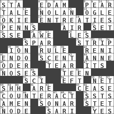 ACROSS 1. R.R. building 4. Dutch treat 8. Lightbulb-shaped fruit 12. Lie 14. Pitcher Ryan 16. Stare at amorously 17. Migrant worker of the '30s 18. Pleas 20. Actor Sean's family 22. Atmosphere 23. Put into a specified state 24. Compass dir. 25. Deep reverence 28. French article 30. Coast Guard woman 31. Long narrow piece of something 35. Electrically charged atom 37. Court order 40. Painter Guido (1575-1642) 41. Inside; within (prefix) 42. Aroma 44. Queen of England 1702-14 45. Baltic tributary 46. Lacerate 47. It is 48. Olfactory organs 50. Adolescent 52. _-fi 54. Lizard (obsolete) 55. Fish or hair follower 58. Quiet! 61. "We ___ not amused" (Victoria) 63. Stop 65. Act in opposition 70. Fast planes 71. So be it 72. Underwater navigation system 73. Proofreading order 74. Thickened enlargement 75. Indian skirt 76. It is so DOWN 1. Constricts 2. Receives possession of 3. Place in a line 4. Compass dir. 5. Spanish title 6. The first octave above the treble staff 7. Hindu Mythology: god of death 8. Plant holder 9. Armor plate that protects the chest 10. Toward shelter 11. Respite 13. Car or cant ending 15. Famous astronaut Armstrong 19. Ancient Greek god of war 21. Plant excrement 26. Armed conflicts 27. Spew [out] 29. Put through a sieve 30. Sounds asleep 32. Monthly bill 33. Lodging establishments 34. Sliced dessert 35. Southeast Asian peninsula 36. Lyric poems 38. Area sheltered from the wind 39. Related on the mother's side 41. A really long time 43. Unclean, religiously 49. Scram, to a cat 51. And so on (abbr.) 53. Angers 55. Thoroughly unpleasant 56. First name in cosmetics 57. Trials 58. Examine hastily 59. Like (prefix) 60. Became colored 62. Greek god of love 64. Double-curved letter 66. Compass dir. 67. Santa ___, CA 68. Automobile 69. Three (prefix)