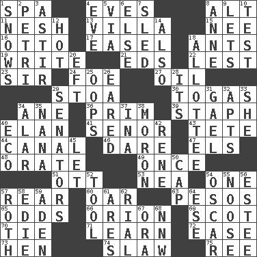 ACROSS 1. Health resort 4. Nights before holidays 8. The first octave above the treble staff 11. Soft 13. Country estate 15. Born 16. Von Bismarck 17. Artist's stand 18. Pismires 19. Compose 21. Begley and Asner 22. For fear that 23. Title for a knight 24. Enemy 27. Petroleum 29. Portico 30. Ancient Roman robes 34. A saturated hydrocarbon 36. Demure 39. Staphylococcus 40. Enthusiasm 41. Sir (Sp.) 43. False hair 44. Lessep's creation 46. Have the gumption 47. Raised railways 48. Speak pompously 49. At one time in the past 51. Baseball player Mel 53. Teachers' org. 54. Single 57. Rump 60. Rowing implement 63. Mexican monetary units 65. Likelihood 66. Constellation of myth 69. Highlander 70. Standoff 71. Memorize 72. Comfort 73. Layer 74. Cole _ (cabbage dish) 75. To riddle DOWN 1. Frozen precipitation (plural) 2. _ dish (used to culture cells) 3. Being in motion 4. Night before a holiday 5. By way of 6. Otherwise 7. Downhill vehicle 8. Singer Murray 9. Allows 10. Trial 12. Being at a high temperature 14. In addition 18. One to whom something is allotted 20. Newt 25. I made a mistake 26. Having ears or earlike features 28. It is 29. Legislators 31. Highlander 32. Flats, for short 33. A female animal or person 34. Having or resembling wings 35. Nanny 37. _ tizzy (2 wds.) 38. Person of subnormal intelligence 40. Environmental prefix 42. French philosopher Descartes 45. Allow 50. Head covering 52. Implement 54. Witty Wilde 55. Trap for birds or small mammals 56. First name in cosmetics 57. Writer of Portnoy's Complaint (1969) 58. Singer Brickell 59. Arabian gulf 61. Ancient Greek god of war 62. Monetary unit of Yemen 64. Compass dir. 67. Mouth or opening 68. Compass dir.