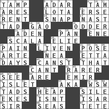 ACROSS 1. Pack (down) 5. The sixth month of the Jewish calendar 9. Scottish cap 12. Ancient Greek god of war 13. Globular water bottle used in Asia 14. Celtic language 15. Monthly bill 16. Fastener 17. Political cartoonist Thomas 18. Small boy 19. E Mali city 21. More peculiar 22. An important port of Yemen 24. Baking dish 26. Compass dir. 27. Any of the three canals of the cochlea 28. Writer Wiesel 29. Ache 30. Make or become more lively 32. Airs 36. Johnson of "Laugh-In" 37. Teachers' org. 38. Singer James 39. 24-hour periods 40. 2nd pers. sing. pres. of can (arch.) 42. Not this but _ 43. Patter 44. More uncommon 46. Perceive with the eye 49. "We ___ not amused" (Victoria) 50. Arab leader 51. Small island 53. Alias (abbr.) 54. Compass dir. 57. Bits 58. Pile 61. Filth; sediment 62. Makes supply last 63. Is not 64. Austrian river, tributary to the Danube 65. Title for a knight 66. Oceans 67. Wig DOWN 1. Small pie 2. Type of rug 3. Ananias' fault 4. Pacific Standard Time (abbr.) 5. In addition 6. Spanish title 7. "One Day ___ Time" 8. Strike 9. Barter 10. NE Netherlands city 11. Distance measurement (Brit.) 14. Conclusion 19. Set 20. Of or related to the anus 21. Single 23. Natives or inhabitants of Denmark 24. Entreaties 25. The 18th letter of the Arabic alphabet 27. "Two Mules for Sister ____" 28. Happening 29. Writing tablet 31. Silly 32. _ dish (used to culture cells) 33. Else 34. Play the lead 35. Ingest 40. 4-wheeled motor vehicle 41. Long journey 43. Feline 45. Housemaid (var.) 46. Settings 47. 1973 Nobel Price Winner (Physics) Leo 48. A person who is older than you are 52. Double-curved letter 53. Flats, for short 55. Narrow board 56. We are 58. Part of HMS, perhaps 59. Compass dir. 60. Santa ___, CA 61. Be seated