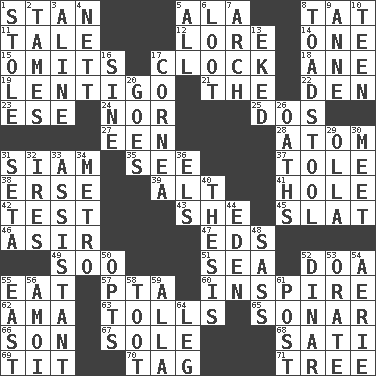 ACROSS 1. Comedian Laurel of Laurel & Hardy 5. According to 8. Make lace 11. Falsehood 12. Old wives' tales, e.g. 14. Single 15. Leaves out 17. Timepiece 18. One (Scot) 19. Small, flat, pigmented spot on the skin 21. Definite Article 22. Lair 23. Compass dir. 24. Not either 25. Two (Sp.) 27. Car or cant ending 28. Smallest unit of an element 31. Thailand, formerly 35. Observe 37. Lacquered or enameled metalware 38. Celtic language 39. The first octave above the treble staff 41. Opening into or through something 42. Trial 43. A female animal or person 45. Narrow board 46. SW Saudi Arabia district 47. Begley and Asner 49. "Barney Miller" actor Jack 51. Ocean 52. ___ good deed 55. Ingest 57. Parent Teacher Assoc. 60. Heighten or intensify 62. Housemaid (var.) 63. For Whom the Bell _____ 65. Echolocation 66. Boy, to dad 67. Not divided or shared with others 68. Suttee (variant) 69. Teat (slang) 70. Label 71. Relationship diagram DOWN 1. Fur scarf 2. Domesticates 3. Place in a line 4. Remaining after all deductions 5. Everything 6. Plunder 7. Bowlike part 8. Inedible or poisonous agaric 9. Queen of England 1702-14 10. Adolescent 13. Supplemented with great effort 16. Trig term 17. Pupil covering 20. Leaves 26. Curses 29. Rounded earthenware pot or jar 30. Confront 31. Bristle 32. Angers 33. Aide 34. Paris' subway 36. Raised railways 40. College paper 44. Paradise 48. Backtalk 50. Chooses 52. Middle Eastern gold or silver currency 53. Speak pompously 54. Nest on high 55. Compass direction 56. Mine, in Marseilles 58. A blast of a horn 59. Silent film actress Nazimova 61. Mail 64. Part of a journey