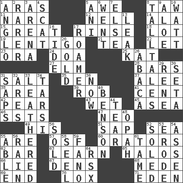 ACROSS 1. Caspian sea tributary 5. Deep reverence 8. The 23rd letter of the Hebrew alphabet 11. Drug cop 12. 1994 drama film starring Jodie Foster 14. According to 15. Relatively large 17. Remove soap 18. Car dealer's back yard 19. Small, flat, pigmented spot on the skin 21. Beverage made from leaves 22. Allow 23. Mouth or opening 24. ___ good deed 25. Krazy ___ of comics 27. Shade tree 28. Taverns 31. Table seasoning 35. Lair 37. Toward shelter 38. Length times width 39. Director Reiner 41. Penny 42. Lightbulb-shaped fruit 43. Dripping 45. At sea 46. Fast planes 47. Modern: prefix 49. Part of HMS, perhaps 51. Plant excrement 52. Ocean 55. "We ___ not amused" (Victoria) 57. Order of Saint Francis (abbr.) 60. Speakers 62. Oblong piece of solid material 63. Acquire or gain knowledge or skills 65. Auras 66. Untruth 67. Habitations of wild animals 68. Ancient Persian 69. Conclude 70. Brine-cured salmon 71. Locale of original sin DOWN 1. White American of non-Hispanic descent 2. More uncommon 3. Sports stadium 4. Get outta here! 5. Black tropical American cuckoo 6. Left 7. Otherwise 8. Baron Munchausen's specialties 9. _ vera 10. Electrical Unit 13. Path through which fluid escapes 16. Event that recurs at intervals 17. Nomad 20. Precious metal 26. Phillipine bananalike plant 29. French philosopher Descartes 30. Stalk of a moss capsule 31. Plant excrements 32. Ancient Greek god of war 33. Tough but pliablecoriaceous 34. Tarsus (plural) 36. Immediately 40. Gillaume's butler role 44. Separate forcefully 48. Brightly colored fish 50. Exchanged or delivered for money 52. Having a sole or soles 53. Eat (away) 54. NE Netherlands city 55. Competent 56. Precipitation 58. Stitch closed the eyes of (a falcon) 59. Papal veil 61. Not wild 64. Acura sports coupe