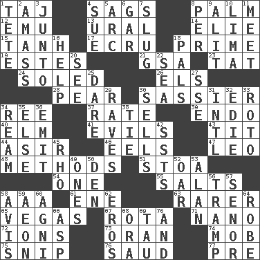 ACROSS 1. _ Mahal 4. Sinks 8. Inside of hand 12. Australian flightless bird 13. Mountain range 14. Writer Wiesel 15. Hyperbolic tangent 17. Shade of tan 18. A-one 19. _____ Park, CO 21. Girls' org. (abbr.) 23. Make lace 24. Having a sole or soles 26. Raised railways 28. Lightbulb-shaped fruit 30. More lively and spirited 34. Portuguese money of account (variant) 37. Assign a rank or rating to 39. Inside; within (prefix) 40. Shade tree 41. Vices 43. Teat (slang) 44. SW Saudi Arabia district 46. Snakelike fish 47. Lion 48. Modes 51. Portico 54. Single 55. Table seasonings 58. American Automobile Association (abbr.) 61. Compass dir. 63. Less widely known 65. Viva Las _ 67. Roll call or roster of names 71. Billionth: prefix 72. Charged particles 73. Northwest Algerian city 74. Crowd into 75. Sever or remove by pinching or nipping 76. Saudi Arabian king (1953-1964) 77. Before (prefix) DOWN 1. Wig 2. Collect or gather 3. Secret group 4. Take to court 5. Curve 6. Slender fish 7. A hard, heavy blow 8. For each 9. Set down 10. Pale green bean 11. Rendezvous 16. Aid 18. Friends 20. Observe 22. Ocean 25. Have the gumption 27. Compass dir. 29. All-night dance parties 30. Exchanges for money 31. International (abbr.) 32. Singer Brickell 33. Printing process, for short 34. 480, 500 or 516 sheets of paper 35. Otherwise 36. Give off 38. Make a knot 42. Fast planes 45. 17th letter of the Greek alphabet 49. Singles 50. Lair 52. Boat paddle 53. ____ Jay Lerner 56. _____ steamer (cargo ship) 57. Sir (Sp.) 58. Deliberation 59. Age 60. Hindu god of fire 62. Greek god of love 64. Loose flowing garment 66. Viper 68. Mouth or opening 69. The 19th letter of the Greek alphabet 70. Plus
