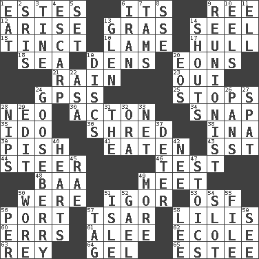 ACROSS 1. _____ Park, CO 6. ___ a Wonderful Life 9. To sift 12. Get up 13. Pate de foie ____ 14. Stitch closed the eyes of (a falcon) 15. A color or tint 16. Unable to walk 17. Frame or body of a ship 18. Ocean 19. Hiding places for outlaws 20. Immeasurably long periods of time 21. Water falling in drops from the sky 23. Fr. "Yes" 24. Global Positioning Systems (abbr.) 25. Constricts 28. Modern: prefix 30. Gambison 34. Fastener 35. Wedding promise 36. Fragment 38. _ tizzy (2 wds.) 39. Expression of disdain 41. Consumed 43. Fast jet (abbr.) 44. Bull 46. Trial 48. Sound made by sheep 49. Confront 50. Past tense of be (plural) 51. Russian composer Stravinsky 53. Order of Saint Francis (abbr.) 56. Left side of a ship or aircraft 57. Russian ruler of old 58. Ms. Damita and namesakes 60. Blunders 61. Toward shelter 62. Learning spot: Fr. 63. Marina Del _, California 64. Set 65. First name in cosmetics DOWN 1. Ingest 2. Indian titles of respect 3. Prong on a fork 4. Fortification 5. Put into a specified state 6. SW Asia republic 7. Scottish caps 8. Compass dir. 9. One who advocates reunion 10. Snakelike fish 11. Pipe bend 13. Small, secluded valley 14. Yells 19. Flat circles 20. Greek goddess of the dawn 22. White ___ sheet 24. Sour, prickly fruit 26. Zero-star reviews 27. Petty quarrel 28. Pinches, bites 29. Prepare for publication 31. Definite Article 32. Mouth or opening 33. Fish or hair follower 37. Prevent from occurring 40. Centers 42. Born 45. Actress Charlotte 47. Unemotional ones 49. Greater amount 50. Had on 51. Capri or Wright 52. Highlander 54. Notch 55. Do some clerical work 56. For each 57. Label 58. Area sheltered from the wind 59. Observe