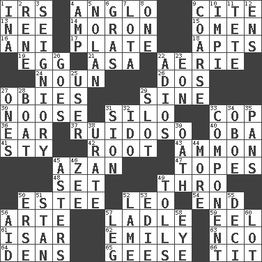 ACROSS 1. Big collection agency 4. White American of non-Hispanic descent 9. Quote 13. Born 14. Person of subnormal intelligence 15. Presage 16. Cuckoo 17. Food holder 18. Flats, for short 19. Oval reproductive body of a fowl 21. White ___ sheet 22. Nest on high 24. Part of speech 26. Two (Sp.) 27. Off-Broadway awards 29. Trig term 30. Trap for birds or small mammals 31. Grain storage tower 33. Police officer (slang) 36. Ewer handle 37. Noisy, rowdy, vocal (Spanish) 40. Chief or king in Benin or Nigeria 41. Filthy place 42. Carrot, for example 43. ID or VA city 45. Muslim summons to prayer 47. Drinks excessively 48. Put into a specified state 49. Through, poetically 50. First name in cosmetics 52. Lion 54. Conclusion 56. Johnson of "Laugh-In" 57. Dipping utensil 59. Snakelike fish 61. Austrian river, tributary to the Danube 62. Poet Dickinson 63. Non-commissioned officer (abbr.) 64. Lairs 65. Honkers 66. Teat (slang) DOWN 1. _ tizzy (2 wds.) 2. French philosopher Descartes 3. Signiory (variant) 4. Electrical Unit 5. Pitcher Ryan 6. Pate de foie ____ 7. Globular water bottle used in Asia 8. Single 9. Rough 10. Body of Kaffir warriors 11. Wig 12. Followers of ems 20. Travels 22. Goodbye (Sp.) 23. A really long time 25. One who uses or employs something 27. Singles 28. Water vessel 29. Groove 31. The Jewish people; Israel 32. Wedding promise 33. Piece 34. Mitch Miller's instrument 35. Zero-star reviews 38. A salt of uric acid 39. Pledge 44. Greater amount 45. Michaelmas daisies 46. Last letter of the English alphabet 49. For Whom the Bell _____ 50. Celtic language 51. Comedian Laurel of Laurel & Hardy 52. Unable to walk 53. Singer Brickell 55. Tenth: prefix 56. Help 57. Part of a journey 58. Sight organ 60. Car dealer's back yard