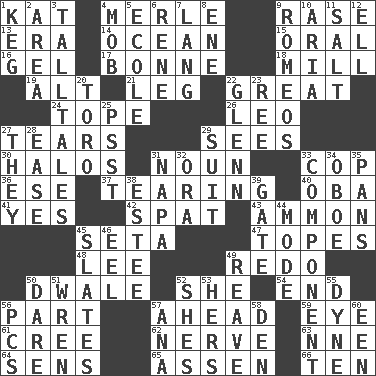 ACROSS 1. Krazy ___ of comics 4. Haggard of country music 9. Raze (variant) 13. Period 14. Sea 15. Spoken 16. Set 17. Child's nurse 18. Place where flour is made 19. Keyboard modifier key 21. Part of a journey 22. Relatively large 24. Drink excessively 26. Lion 27. Pulls into pieces 29. Perceives with the eye 30. Saint headwear 31. Part of speech 33. Police officer (slang) 36. Compass dir. 37. Lacerating 40. Chief or king in Benin or Nigeria 41. Affirmative reply 42. Petty quarrel 43. ID or VA city 45. Bristle 47. Drinks excessively 48. Area sheltered from the wind 49. Make new 50. A sleeping potion; an opiate (poet.) 52. A female animal or person 54. Conclude 56. Piece 57. Forward in time 59. Sight organ 61. Algonquian 62. Impudent aggressiveness 63. Compass dir. 64. Elected reps. 65. NE Netherlands city 66. Nine, plus one DOWN 1. Barrel 2. Type of rug 3. Baron Munchausen's specialties 4. Disorderly crowd 5. Learning spot: Fr. 6. French philosopher Descartes 7. Long (Scottish) 8. Compass dir. 9. Lover boys 10. Roberta Peters solo 11. Table seasoning 12. Pipe bend 20. "Corrida" creature 22. American astronaut and politician John 23. To separate or throw off 25. Inconspicuous attention getter 27. Those things 28. Comfort 29. Set or collection 31. California wine valley 32. Mouth or opening 33. Piece 34. Mitch Miller's instrument 35. Baking dishes 38. First name in cosmetics 39. Yard entry 44. Method 45. Chalkboards 46. Snakelike fish 49. Break or tear apart 50. Have the gumption 51. Songbird 52. "______ My Girl" (Turtles hit) 53. Possessive pronoun 55. Unit of force 56. Personal Computers (abbr.) 57. Santa ___, CA 58. Lair 60. Car or cant ending