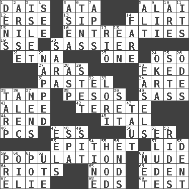 ACROSS 1. Raised platform 5. "One Day ___ Time" 8. Mountain range southwest of Kyrgyzstan 12. Celtic language 13. Small drink 14. Talk or behave amorously 15. The longest river in the world 16. Pleas 19. Compass dir. 20. More impudent 21. Inactive volcano in Sicily 23. Single 24. Bear (Spanish) 27. Caspian sea tributary 30. Made supply last 31. Soft color 34. Johnson of "Laugh-In" 35. Pack (down) 38. Mexican monetary units 40. Backtalk 41. Toward shelter 42. Cigar-shaped 44. Tear apart 45. Slanted text style (abbr.) 46. Personal Computers (abbr.) 47. Curvy letter 50. One who uses or employs something 53. Curse 57. Flaplike covering 59. Census information 63. Unadorned 64. Disturbances 65. Allow head to fall sleepily 66. Locale of original sin 67. Writer Wiesel 68. Begley and Asner 69. Trial DOWN 1. Lairs 2. Get up 3. Small island 4. Observe 5. At sea 6. Airtight sealed metal containers 7. Tenement units (abbr.) 8. Keyboard modifier key 9. Cards in a Roman deck? 10. "We ___ not amused" (Victoria) 11. ___ a Wonderful Life 14. Conductor's collection 17. _ de Janeiro 18. Car or cant ending 20. "Two Mules for Sister ____" 22. Slept 24. Gumbo ingredient 25. Puts into a specified state 26. Lyric poems 28. Viper 29. Proofreading order 30. Artist's stands 32. Compass dir. 33. Australian parrot (variant) 35. Canvas cover 36. Actor Baldwin 37. Not women's 39. Put into a specified state 43. Pulled tight 47. Snakelike fish 48. Health resort 49. Be seated 51. Evade 52. Amusement-park features 54. Prong on a fork 55. Parka part 56. Conclusions 58. Scratch 59. Before (prefix) 60. Petroleum 61. Luau course 62. Shoshoni 63. Fish or hair follower
