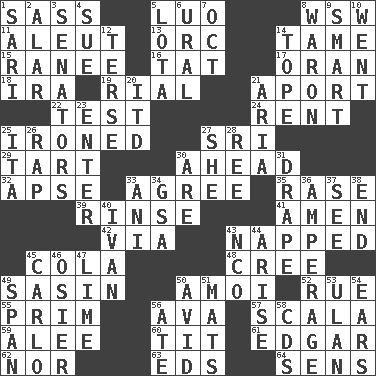 ACROSS 1. Backtalk 5. Nilotic language 8. Compass dir. 11. Native American of Southwest Alaska 13. The grampus (Milton) 14. Not wild 15. Indian princess (variant) 16. Make lace 17. NW Algerian seaport 18. Retirement account (abbr.) 19. Monetary unit of Yemen 21. To the left, to Queeg 22. Trial 24. Monthly bill 25. Pressed 27. _ Lanka 29. Small pie 30. At or in the front 32. Domed church section 33. Match 35. To erase 39. Remove soap 41. So be it 42. By way of 43. Slept 45. Root beer relative 48. Algonquian 49. Indian antelope 50. Mine, in Marseilles 52. Sorrow 55. Demure 56. Actress Gardner 57. Any of the three canals of the cochlea 59. Toward shelter 60. Teat (slang) 61. _ Allan Poe 62. Or not 63. Begley and Asner 64. Elected reps. DOWN 1. Indian skirt 2. Having or resembling wings 3. Legislators 4. Take to court 5. Globular water bottle used in Asia 6. Mountain range 7. Sep. follower 8. Make _____ (do battle with) 9. Don Adams' spy role 10. Gone 12. Laconic 14. Drink excessively 20. It would 21. Operatic vocal solo 23. Keyboard key 25. Call ___ day 26. Hit sharply and swiftly 27. A female animal or person 28. To separate or throw off 30. "We ___ not amused" (Victoria) 31. Window treatment 33. Cuckoo 34. Girls' org. (abbr.) 36. Electrical Measurement 37. Observe 38. Conclude 40. "Terrible" tsar 43. Non-commissioned officer (abbr.) 44. Ascend 45. Monte _, Las Vegas Hotel/Casino 46. Flexible twig of a willow tree 47. Welles in "The Third Man" 49. Connect, as a bridge 50. Enthusiastic 51. Floor protectors 53. Uhlan (variant) 54. Hearing organs 56. Had dinner 58. Music discs