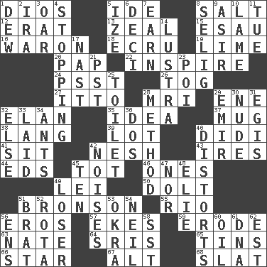 ACROSS 1. "Vaya con ____" 5. Binary compound 8. Table seasoning 12. Part of Q.E.F. 13. Ardor 15. Son of Isaac 16. Make _____ (do battle with) 18. Shade of tan 19. Welles in "The Third Man" 20. Infant food 22. Heighten or intensify 24. Inconspicuous attention getter 26. Coat; cloak 27. "Tell ____ the Marines!" 28. Medical imaging device (abbr.) 29. Compass dir. 32. Liveliness 35. The main thing one is thinking about 37. Large cup 38. Austrian-born American filmmaker Fritz 39. Car dealer's back yard 40. "You Light Up My Life" star Conn 41. Be seated 42. Tender 43. Angers 44. Begley and Asner 45. Small child 46. Singles 49. Flowery wreath 50. Dunce 51. "Death Wish" actor 55. River (Sp.) 56. Greek god of love 57. Supplements with great effort 59. Wear away 63. Nathan's nickname 64. Indian titles of respect 65. Airtight sealed metal containers 66. Play the lead 67. Keyboard modifier key 68. Narrow board DOWN 1. Morning condensation 2. Lyricist Gershwin 3. Rowing implement 4. Obstructing or blocking passage 5. Ending with capital 6. Tenth: prefix 7. Merit 8. Former Milwaukee Brewers owner Bud 9. SW Saudi Arabia district 10. Unable to walk 11. Third day of the wk. 14. A period of five years 17. Political cartoonist Thomas 21. Pacific Standard Time (abbr.) 23. Luau course 25. Bathroom 28. Mode 29. Arab leader 30. Unadorned 31. Armor plate that protects the chest 32. Otherwise 33. Put down 34. Pismires 36. Two (Sp.) 40. What propaganda does 42. Annoying sounds 45. "___ Little Indians" 47. Or not 48. Writer Wiesel 49. Failure 51. Naughty child 52. Roll call or roster of names 53. Gumbo ingredient 54. Famous astronaut Armstrong 56. Followers of ems 58. Fast jet (abbr.) 60. Lubricate 61. Heredity factor (abbr.) 62. Eastern Standard Time (abbr.)