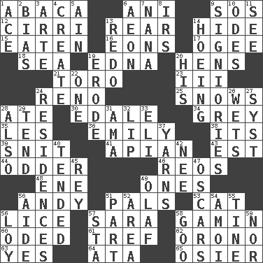 ACROSS 1. Phillipine bananalike plant 6. Black tropical American cuckoo 9. Distress signal 12. High-altitude cloud 13. Located in or toward the back 14. Flintstone garb 15. Eroded 16. Immeasurably long periods of time 17. Double curve, resembling the letter S 18. Ocean 19. Pulitzer Prize-winning author Ferber 20. Coop moms 21. "Corrida" creature 23. One more than two 24. Former U.S. Attorney General Janet 25. Overwhelms 28. Had dinner 30. Peak District village in England 34. Jennifer or Joel 35. French article 36. Poet Dickinson 38. It is 39. In a ____ (agitated or irritated) 41. Bee-related 43. Eastern Standard Time (abbr.) 44. More peculiar 46. Vintage cars 48. Compass dir. 49. Singles 50. "60 Minutes" Commentator Rooney 51. Friends 53. Domesticated feline 56. Louse (plural) 57. "Two Mules for Sister ____" 58. Street urchin 60. Wrote a lyric poem 61. Unclean, religiously 62. U. of Maine site 63. Consenting reply 64. "One Day ___ Time" 65. Flexible twig of a willow tree DOWN 1. Adept person 2. Prejudice 3. Johnson of "Laugh-In" 4. Cause to be 5. The 18th letter of the Arabic alphabet 6. Age 7. Nanny 8. Big collection agency 9. Seigniories (variant) 10. Lyric poems 11. Observe 13. Make new 14. Cultivating 19. Eat (away) 20. Part of HMS, perhaps 22. Single 24. Homes 26. Soaks 27. System (abbr.) 28. In addition 29. Be inclined (to) 31. Housemaid (var.) 32. Mouth edge 33. Connecticut Ivy Leaguer 37. Tall tales 40. Watched over 42. Born 45. Marina Del _, California 47. Motion picture awards 49. Norwegian king 50. Helper 51. Role in a play 52. Type of rug 54. Mine, in Marseilles 55. Prong on a fork 56. Myrna of the movies 57. R.R. building 58. Thick or sticky substance 59. Or not
