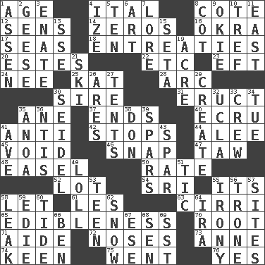 ACROSS 1. Personal question 4. Slanted text style (abbr.) 8. ____ d'Azur (French Riviera) 12. Elected reps. 14. Nothings 16. Gumbo ingredient 17. Oceans 18. Pleas 20. _____ Park, CO 22. And so on (abbr.) 23. Lizard (obsolete) 24. Born 25. Krazy ___ of comics 28. Curve 30. The founder of a family 31. Spew [out] 35. A saturated hydrocarbon 37. Extremities 40. Shade of tan 41. Against 42. Constricts 44. Toward shelter 45. Lacking any legal or binding force 46. Fastener 47. The 23rd letter of the Hebrew alphabet 48. Artist's stand 50. Pace 52. Car dealer's back yard 54. _ Lanka 55. ___ a Wonderful Life 58. Allow 61. French article 63. High-altitude cloud 65. The property of being fit to eat 70. Carrot, for example 71. Assistant 72. Olfactory organs 73. Queen of England 1702-14 74. Peachy ____! 75. Gone 76. Consenting reply DOWN 1. NE Netherlands city 2. Honkers 3. Related on the mother's side 4. Ending with capital 5. Nine, plus one 6. Nonscientific branch of learning 7. Old wives' tales, e.g. 8. Small bed 9. Migrant worker of the '30s 10. Not kosher 11. Compass direction 13. Compass dir. 15. Bristle 19. 1/640 square mile 21. What Jean-Claude Killy likes to do 26. Ancient Greek god of war 27. Portable shelters 29. Cause to be 30. Beer mug 32. Southern CA. univ. 33. Ship's personnel 34. Third day of the wk. 35. Small Philippine buffalo 36. Nuclear Threat Initiatives 38. Spanish title 39. Practice fights 41. "___ Maria" 43. Practice fight 49. Hang loosely or laxly 51. Nervous spasm 53. Adolescent 55. Literary sarcasm 56. Heavy duty weighing machine 57. Locates 58. Path through which fluid escapes 59. Singer Brickell 60. Event that recurs at intervals 62. Frozen precipitation 64. Lyricist Gershwin 66. Benjamin's nick name 67. Compass dir. 68. Elected rep. 69. Fast jet (abbr.)