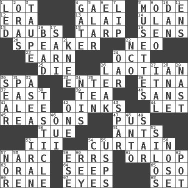 ACROSS 1. Car dealer's back yard 4. Highlander 8. Method 12. Epoch 13. Mountain range southwest of Kyrgyzstan 14. ____ Bator 15. Applies to a surface 18. Canvas cover 19. Elected reps. 20. Orator 22. Modern: prefix 23. Merit 24. Sep. follower 25. Expire 26. Of or relating to Laos or its people 30. Health resort 33. Keyboard key 36. Inactive volcano in Sicily 37. Compass direction 39. Beverage made from leaves 40. Without 41. Toward shelter 42. Pig sounds 44. Allow 45. Thinks logically 47. Fluid product of inflammation 50. Third day of the wk. 51. Pismires 53. One more than two 54. Window treatment 57. Drug cop 59. Blunders 61. Fourth or lowest deck 63. Spoken 64. Ooze 65. Bear (Spanish) 66. French philosopher Descartes 67. Sight organs 68. Put into a specified state DOWN 1. Directed 2. Mouths or openings 3. Grayish beige 4. Yard entry 5. Having or resembling wings 6. Hearing organ 7. Mouth edge 8. French bagpipes 9. Margarine 10. One of the 12 tribes of Israel 11. Followers of ems 16. Necklace unit 17. Indian skirt 21. Leg joint 22. Non-commissioned officer (abbr.) 24. Boat paddle 26. Path through which fluid escapes 27. Slanted text style (abbr.) 28. Queen of England 1702-14 29. Political cartoonist Thomas 30. Burn superficially 31. Light colored 32. Toward the sea 34. Nuclear Threat Initiatives 35. "___ Little Indians" 38. One of the two male reproductive glands 42. Single 43. Practice fight 46. Fr. "Yes" 48. To (old English) 49. Play the lead 52. Grain storage towers 53. SW Asia republic 54. Algonquian 55. United States Postal Service (abbr.) 56. Sense of smell 57. Or not 58. "We ___ not amused" (Victoria) 59. Compass dir. 60. Marina Del _, California 62. Cooking vessel