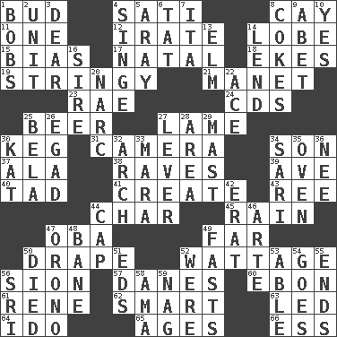 ACROSS 1. Partially opened flower 4. Suttee (variant) 8. Island 11. Single 12. Feeling or showing extreme anger 14. Ear part 15. Prejudice 17. Relating to or accompanying birth 18. Supplements with great effort 19. Slender, wiry 21. French painter Edouard 23. Actress Charlotte 24. Music discs 25. Fermented drink made from hops 27. Unable to walk 30. Cask 31. Device for capturing images 34. Male offspring 37. Wing 38. All-night dance parties 39. "___ Maria" 40. Small boy 41. Make 43. Portuguese money of account (variant) 44. Burn to charcoal 45. Precipitation 47. Chief or king in Benin or Nigeria 49. Distant 50. Window treatment 52. Electrical Measurement 56. The Jewish people; Israel 57. Natives or inhabitants of Denmark 60. Inky black, to poets 61. French philosopher Descartes 62. Don Adams' spy role 63. Directed 64. Wedding promise 65. Grows older 66. Curvy letter DOWN 1. Moves up and down 2. A single undivided whole 3. Letter starter 4. Scorch 5. Like ___ of sunshine 6. Make lace 7. Call ___ day 8. Popular sodas 9. Collude with 10. Consenting reply 13. Shade tree 14. Grant temporary use of 16. Male parent of an animal 20. Drug cop 22. Adept person 25. Actor Lugosi 26. Mild oath 27. Crowbar 28. Length times width 29. Vertical spar for supporting sails 30. Krazy ___ of comics 32. Bowlike part 33. Hindu Mythology: god of death 34. Indian skirt 35. Baking chamber 36. Born 42. Part of Q.E.F. 44. Head covering 46. Johnson of "Laugh-In" 47. U. of Maine site 48. Object of repulsion 49. Goes without food and/or water 50. Passed on 51. Begley and Asner 52. We are 53. Competent 54. Moves 55. Extremities 56. Indian title of respect (Mr.) 58. Housemaid (var.) 59. Tired old horse