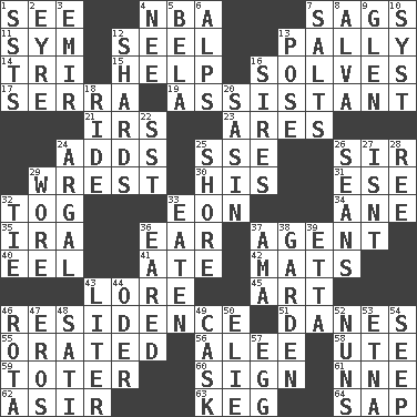 ACROSS 1. Perceive with the eye 4. Basketball assoc. 7. Settles 11. Symbol (abbr.) 12. Stitch closed the eyes of (a falcon) 13. Chummy 14. Three (prefix) 15. Assist 16. Finds the solution 17. Father Junipero _ 19. Aide 21. Big collection agency 23. Ancient Greek god of war 24. Sums up 25. Compass dir. 26. Title for a knight 29. Take or capture by force 30. Part of HMS, perhaps 31. Compass dir. 32. Coat; cloak 33. A really long time 34. One (Scot) 35. Lyricist Gershwin 36. Ewer handle 37. Representative 40. Snakelike fish 41. Had dinner 42. Floor protectors 43. Old wives' tales, e.g. 45. Nonscientific branch of learning 46. Home 51. Natives or inhabitants of Denmark 55. Spoke pompously 56. Toward shelter 58. Shoshoni 59. Carrier 60. Attach a signature 61. Compass dir. 62. SW Saudi Arabia district 63. Barrel 64. Plant excrement DOWN 1. Fast planes 2. Jane of fiction 3. Independent ruler or chieftain 4. Born 5. Actor Lugosi 6. High mountains 7. Table seasonings 8. Inventor's middle name 9. Small, secluded valley 10. System (abbr.) 12. Pottery fragments 13. Airs 16. Begets 18. Travel on an animal 20. Indian antelope 22. Fast jet (abbr.) 24. Therefore, facetiously 25. Dinah or Pauly 26. Seines 27. Is not 28. To sift 29. Had on 32. Make a knot 33. Ingested 36. Having ears or earlike features 37. Nursemaid (var.) 38. Place where plants grow 39. Singer James 43. 61 cubic inches 44. Baltic tributary 46. Round or rotation of duties 47. Greek god of love 48. Suttee (variant) 49. Keg 50. Writer Wiesel 52. Religious women 53. Inactive volcano in Sicily 54. Ooze 57. Oval reproductive body of a fowl