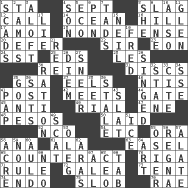 ACROSS 1. R.R. building 4. Back-to-school mo. 8. Volcanic refuse 12. Give a ring to 14. Sea 16. Land elevation 17. Mine, in Marseilles 18. Unrelated to defense, as in spending 20. Put off 22. Title for a knight 23. A really long time 24. Fast jet (abbr.) 25. Begley and Asner 28. French article 30. It's straight from the horse's mouth 31. Flat circles 35. Girls' org. (abbr.) 37. Snakelike fish 40. Nuclear Threat Initiatives 41. Mail 42. Confronts 44. Yard entry 45. Against 46. Monetary unit of Yemen 47. Compass dir. 48. Mexican monetary units 50. Put down 52. Non-commissioned officer (abbr.) 54. And so on (abbr.) 55. Mouth or opening 58. Santa ___, CA 61. Wing 63. Artist's stand 65. Frustrate 70. Capital of Latvia 71. General guideline 72. An organ shaped like a helmet 73. Portable shelter 74. Inside; within (prefix) 75. Messy guy 76. Actress Charlotte DOWN 1. Large numbers or amounts 2. Domesticates 3. Upward 4. Boy, to dad 5. Environmental prefix 6. Animal enclosure 7. Small amounts or degrees 8. A female animal or person 9. Actor's bit 10. In addition 11. Small, secluded valley 13. Whopper 15. Famous astronaut Armstrong 19. Flintstone 21. Portuguese money of account (variant) 26. South Vietnam president (1954) 27. Scornful expression 29. Burned superficially 30. Food allowance for one day 32. Comedian Laurel of Laurel & Hardy 33. Quote 34. Compass dir. 35. Went 36. Fast planes 38. Flowery wreath 39. Showing deterioration from age 41. Infant food 43. Narrow board 49. Scram, to a cat 51. Frozen water 53. Cassini of fashion 55. Flexible twig of a willow tree 56. Canadian anthropologist Darnell 57. Having winglike extensions 58. 43,560 square feet 59. Part of speech 60. Old (Scot.) 62. Caspian sea tributary 64. Nonscientific branch of learning 66. Modern: prefix 67. Everything 68. Corporate head (abbr.) 69. Keyboard key