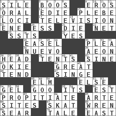 ACROSS 1. Filth; sediment 5. Scornful sounds 9. Greek god of love 13. Of the mouth 14. Singer Brickell 15. Cadet 16. Event scenes 17. Household entertainment appliance 19. Compass dir. 20. Curvy letter 21. Expire 22. Fish or hair follower 23. Fast planes 25. It is so 26. Artist's stand 30. Entreaty 34. New (sp.) 35. Period of immesurable duration 36. Froth on beer 39. Portable shelters 42. Trig term 43. Migrant worker of the '30s 44. Relatively large 46. Watch over 47. Scorch 48. Shade tree 51. Otherwise 54. Set 57. Thick or sticky substance 58. It is 60. Eastern Standard Time (abbr.) 62. Appease 65. Johnson of "Laugh-In" 66. Locates 67. Three-handed card game 68. Songbird 69. Dry up 70. Falsehood 71. 90 degrees DOWN 1. Flatfish 2. Metal shackles 3. Shoestrings 4. Biblical high priest 5. Stakes 6. Lyric poems 7. Petroleum 8. Shabby and untidy 9. Raised railways 10. It's straight from the horse's mouth 11. Mitch Miller's instrument 12. Emitted 15. Sliced desserts 18. Compete 20. He sold his birthright 24. Watched over 27. Arrange properly for use 28. First lady 29. Yearns 30. Soft color 31. Luau accessory 32. Period of immesurable duration 33. One (Scot) 36. Being at a high temperature 37. Supplement with great effort 38. The 18th letter of the Arabic alphabet 40. Three (prefix) 41. Elected rep. 45. Ripens 48. The front part of a cuirass 49. Car dealer's back yard 50. Damp 52. Father Junipero _ 53. _____ Park, CO 54. Global Positioning Systems (abbr.) 55. 4th largest of the Great Lakes 56. Globular water bottle used in Asia 58. Slanted text style (abbr.) 59. Wig 61. Portable shelter 63. For each 64. Alias (abbr.) 65. Deep reverence