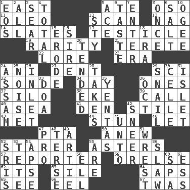 ACROSS 1. 90 degrees 5. Had dinner 8. Bear (Spanish) 11. Butter sub 12. Glance over 13. Tired old horse 14. Chalkboards 17. A testis 19. Noteworthy scarcity 21. Cylindrical with tapered ends 22. Old wives' tales, e.g. 23. Period 24. Cuckoo 27. Scratch 29. _-fi 32. Something which is sent 34. 24 hours 36. Singles 37. Grain storage tower 38. Make supply last 39. Give a ring to 40. Toward the sea 41. Lair 42. Vertical member of a panel or frame 43. Was introduced to 44. Surprise greatly 46. Allow 47. Parent Teacher Association (abbr.) 50. Afresh 52. A viewer who gazes fixedly 55. Michaelmas daisies 57. News announcer 59. Threatening words 62. ___ a Wonderful Life 63. Drop; flow; fall 64. Plant excrements 65. Perceive with the eye 66. Snakelike fish 67. It was, poetically DOWN 1. Greek goddess of the dawn 2. Everything 3. Burn superficially 4. Add up to 5. Adept person 6. Clothes sense 7. Keyboard key 8. Single time 9. Table seasoning 10. Double curve, resembling the letter S 12. Filthy place 15. Wear away 16. Father 18. Retirement account (abbr.) 20. Looked after 24. Indian state 25. Annoying sound 26. An arm off of a larger body of water 28. Receives possession of 29. Slow-paced one 30. Cell (Danish) 31. Small island 33. ___ good deed 35. Gossips 36. Sep. follower 42. Scornful expression 45. To (old English) 47. Adept person 48. Laconic 49. Nick name for Arthur 51. Take or capture by force 52. Indian titles of respect 53. False hair 54. Domed church section 55. "We ___ not amused" (Victoria) 56. Cole _ (cabbage dish) 58. Pipe bend 60. Health resort 61. Curvy letter
