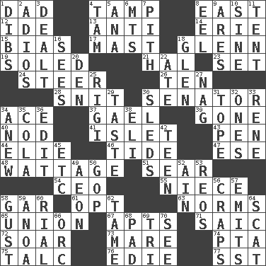 ACROSS 1. June honoree 4. Pack (down) 8. 90 degrees 12. Binary compound 13. Opposed to 14. 4th largest of the Great Lakes 15. Prejudice 17. Vertical spar for supporting sails 18. American astronaut and politician John 19. Having a sole or soles 21. Actor Linden 23. Arrange properly for use 24. Bull 26. "___ Little Indians" 28. In a ____ (agitated or irritated) 30. Legislator 34. Adept person 37. Highlander 39. Went 40. Dreamland 41. Small island 43. Fenced enclosure 44. Writer Wiesel 46. Periodic rise and fall of the sea level 47. Compass dir. 48. Electrical Measurement 51. Shrivel 54. Corporate head (abbr.) 55. Sibling's daughter 58. Slender fish 61. Choose 63. Typical models 65. The state of being joined or united 67. Tenement units (abbr.) 71. Ketch in the Levant 72. Fly high 73. Female horse 74. Parent Teacher Assoc. 75. Baby powder 76. Singer Brickell 77. Fast jet (abbr.) DOWN 1. Rights 2. Goodbye (Sp.) 3. Started a card game 4. Scottish cap 5. Santa ___, CA 6. Mountains (abbr.) 7. Heart or essence 8. Snakelike fish 9. Ancient Greek god of war 10. Trig term 11. Portable shelter 16. Observes 18. Small, secluded valley 20. Lair 22. Had dinner 25. Swiss mountan, "Queen of the Mountains" 27. Tired old horse 29. Clothes sense 30. Bobsleighs 31. Drink excessively 32. Singles 33. French philosopher Descartes 34. Afresh 35. Root beer relative 36. Prepare for publication 38. Biblical high priest 42. Adolescent 45. And so on (abbr.) 49. Age 50. Republican Party 52. The 18th letter of the Arabic alphabet 53. Vintage cars 56. Dice game 57. Sends forth 58. Abrupt rush of wind 59. Small Philippine buffalo 60. Monetary unit of Yemen 62. Docile 64. Jazz singing style 66. The grampus (Milton) 68. Writing tablet 69. Three (prefix) 70. Perceive with the eye