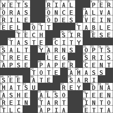 ACROSS 1. Soaks 5. Monetary unit of Yemen 9. For each 12. Mouths or openings 13. Single time 14. Inventor's middle name 15. Cause heat under the collar 16. Lyric poems 17. Distinctive style or manner 18. Snakelike fish 19. Baseball player Mel 21. Eating place 22. Technical work 24. Title for a knight 26. Compass dir. 27. Clothes sense 28. Municipality 29. Table seasoning 30. Entertaining tales 32. Chooses 36. Woody plant 37. Part of a journey 38. Indian titles of respect 39. Domed church section 40. Some stationery 42. Penny 43. Haul 44. Collect or gather 46. Observe 49. Had dinner 50. Indian skirt 51. Taiwanese island in East China Sea 53. Marina Del _, California 54. Heredity factor (abbr.) 57. American tennis player Robert 58. In addition 61. Adolescent 62. It's straight from the horse's mouth 63. Small pie 64. To the inside or interior of 65. Affectionate concern, for short 66. Capital of Western Samoa 67. Singer James DOWN 1. Had on 2. 4th largest of the Great Lakes 3. Baron Munchausen's specialties 4. Compass dir. 5. Carrot, for example 6. Working for oneself (abbr.) 7. Adept person 8. French article 9. Cadet 10. Vices 11. Indian princess (variant) 14. Actress Gardner 19. Sep. follower 20. Those things 21. Attempt 23. First name in cosmetics 24. Scorch 25. It is 27. Canvas cover 28. Streamer paper 29. R.R. building 31. Having winglike extensions 32. Motion picture award 33. Elected leader of a country 34. Airtight sealed metal containers 35. Fast jet (abbr.) 40. Cooking vessel 41. To erase 43. The 19th letter of the Greek alphabet 45. Can I? 46. Don Adams' spy role 47. Artist's stand 48. Value system 52. Elected rep. 53. Roll call or roster of names 55. Remaining after all deductions 56. Small Philippine buffalo 58. _ moment's notice (2 wds.) 59. Infant locale 60. _ Lanka 61. Make a knot