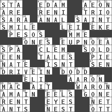 ACROSS 1. R.R. building 4. Dutch treat 8. A really long time 12. "We ___ not amused" (Victoria) 13. Painter Guido (1575-1642) 14. Musical group of three 15. "Two Mules for Sister ____" 17. Of or related to the anus 18. Virtuous person 19. Grin 21. Flowery wreath 23. Supplement with great effort 24. Mexican monetary units 26. Madame (abbr.) 28. Washington bills 30. Normal relaxed breathing 34. Health resort 37. To starve (Brit.) 39. Disposed of to a purchaser 40. Car or cant ending 41. Stories 43. Sliced dessert 44. Nathan's nickname 46. Is not 47. Elected rep. 48. Popular '50s hangout 51. Texas town _ City 54. Connecticut Ivy Leaguer 55. Composer Copland 58. Big _ 61. Small island 63. Make _____ (do battle with) 65. With great haste 67. Snakelike fish 71. Went 72. Monthly bill 73. Sight organs 74. Fish or hair follower 75. Pismires 76. A home for chicks 77. Baseball player Mel DOWN 1. Backtalk 2. _____ steamer (cargo ship) 3. Nest on high 4. Epoch 5. Lair 6. Santa ___, CA 7. Place where flour is made 8. _ moment's notice (2 wds.) 9. One of the Great Lakes 10. Pig sound 11. Brief written record 16. In addition 18. Simple or foolish person 20. Age 22. Australian flightless bird 25. Religious group 27. Followers of ems 29. Killed 30. Make improvements or corrections to 31. I made a mistake 32. Writer Wiesel 33. An important port of Yemen 34. Transmit 35. Lightbulb-shaped fruit 36. Against 38. Raised railways 42. Portico 45. First lady 49. Flair 50. One more than two 52. Obsolete 53. To trail on the ground 56. U. of Maine site 57. Music written for nine 58. Hindu Mythology: god of death 59. So be it 60. Patter 62. Adolescent 64. Remaining after all deductions 66. It is 68. Sight organ 69. French article 70. Fast jet (abbr.)