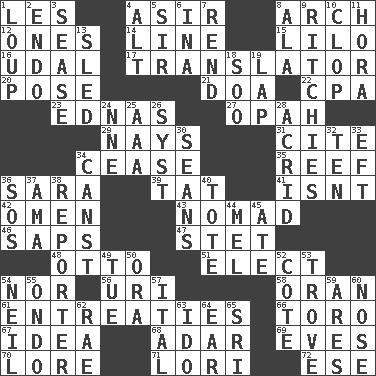 ACROSS 1. French article 4. SW Saudi Arabia district 8. Bowlike part 12. Washington bills 14. Actor's bit 15. _ and Stitch 16. Freehold land 17. Interpreter 20. Airs 21. ___ good deed 22. Accounting whiz (abbr.) 23. Ferber et al. 27. Brightly colored fish 29. Negative votes 31. Quote 34. Stop 35. Coral collection 36. "Two Mules for Sister ____" 39. Make lace 41. Is not 42. Sign of something about to happen 43. Wanderer 46. Plant excrements 47. Proofreading order 48. Von Bismarck 51. Choose 54. Or not 56. RI univ. 58. Northwest Algerian city 61. Pleas 66. "Corrida" creature 67. It may be bright or harebrained 68. The sixth month of the Jewish calendar 69. Nights before holidays 70. Old wives' tales, e.g. 71. Australian parrot (variant) 72. Compass dir. DOWN 1. Central Nebraska county 2. Inside; within (prefix) 3. Gospel singer Marvin 4. Keyboard modifier key 5. Title for a knight 6. _ tizzy (2 wds.) 7. Tear apart 8. Insect wing 9. Actors Guy, Robert Welles, and Clint 10. Hoof sound 11. Israeli folk dance 13. Downhill vehicle 18. "Barney Miller" actor Jack 19. Infant locale 24. Compass dir. 25. Auto club (abbr.) 26. System (abbr.) 28. Bitter 30. Actors Connery and Penn 32. Nine, plus one 33. Newt 34. 2nd pers. sing. pres. of can (arch.) 36. Distress signal 37. Nursemaid (var.) 38. News announcer 40. Haul 44. Cartoonist voice _ Blanc 45. Had dinner 49. Third day of the wk. 50. Mouth or opening 52. ____ d'Azur (French Riviera) 53. Collection of objects 54. Famous astronaut Armstrong 55. Southwest Nigerian state 57. Slanted text style (abbr.) 59. Ancient Greek god of war 60. Characteristic smell of wine 62. Actress Charlotte 63. Wedding promise 64. Ewer handle 65. _ Lanka