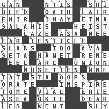 ACROSS 1. Separate the seeds from cotton 4. Nuclear Threat Initiatives 8. Indian title of respect (Mr.) 11. Butter sub 13. Pledge 14. Den 15. Arab leader 16. "If ____ say so..." 17. Inactive volcano in Sicily 18. Deli grouping 21. Robbery 22. Goldbrick 23. White ___ sheet 25. Born 26. Hearing organ 29. A testis 32. Thick slices 34. Wedding promise 35. Actress Gardner 38. Stalk of a moss capsule 39. French painter Edouard 41. French philosopher Descartes 43. Snakelike fish 44. Curve 45. The state of being joined or united 46. French bagpipes 50. Compass dir. 51. Make lace 54. R.R. building 55. I made a mistake 57. Declaim 59. Motivate 63. Heavy book 64. Small bottle 67. One of the Great Lakes 68. Toward the sea 69. Migrant worker of the '30s 70. Letter starter 71. French article 72. Left 73. Wily DOWN 1. Travels 2. _ mater 3. Famous astronaut Armstrong 4. Annoying sounds 5. Scottish cap 6. Call ___ day 7. Like a shrinking violet 8. Smooth fabric 9. Wash lightly 10. Feeling or showing extreme anger 12. Of the mouth 14. Area sheltered from the wind 19. Floor coverings 20. Ending with capital 21. Actor Linden 23. Helper 24. Highlander 26. Double-curved letter 27. Toward shelter 28. Assign a rank or rating to 30. Colored lightly or faintly 31. Merit 33. Lip ointment 36. Distinctive style or manner 37. Soon (poet.) 39. Vertical spar for supporting sails 40. Type of rug 42. Compass dir. 45. United States Postal Service (abbr.) 47. Purpose 48. Bathroom 49. A really long time 51. "_____ Recall" 52. Came up 53. Softens 56. Hurried 58. Afternoon social gathering 60. Angers 61. Monetary unit of Yemen 62. Suggestive of the supernatural 64. Promise 65. D.D.E's nickname 66. The 18th letter of the Arabic alphabet