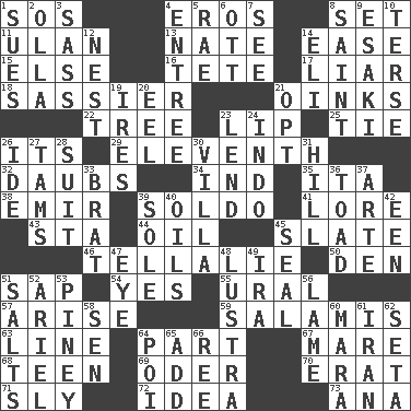 ACROSS 1. Distress signal 4. Greek god of love 8. Arrange properly for use 11. ____ Bator 13. Nathan's nickname 14. Relaxation 15. Otherwise 16. False hair 17. One who doesn't tell the truth 18. More lively and spirited 21. Pig sounds 22. Woody plant 23. Mouth edge 25. Standoff 26. It is 29. Veterans Day date 32. Applies to a surface 34. Indiana (abbr.) 35. Call ___ day 38. Arab leader 39. Twentieth part of a lira 41. Old wives' tales, e.g. 43. R.R. building 44. Petroleum 45. Schedule 46. Copy Pinocchio 50. Lair 51. Plant excrement 54. Consenting reply 55. Mountain range 57. Get up 59. Deli grouping 63. Actor's bit 64. Component 67. Female horse 68. Adolescent 69. Baltic tributary 70. Part of Q.E.F. 71. Wily 72. The main thing one is thinking about 73. Santa ___, CA DOWN 1. Institutes legal proceedings 2. Spanish pot 3. Backtalk 4. Main course 5. Actress Charlotte 6. Baseball player Mel 7. Perceive with the eye 8. Virtuous person 9. 1973 Nobel Price Winner (Physics) Leo 10. Laconic 12. A home for chicks 14. Biblical high priest 19. Angers 20. Snakelike fish 21. Elect 23. Grant temporary use of 24. _ china 26. Binary compound 27. Scottish caps 28. Set or collection 30. Country estate 31. Land elevation 33. Naughty child 36. Frog relative 37. Johnson of "Laugh-In" 39. Flatfish 40. Lubricates 42. Car or cant ending 45. Lick closed 47. Sight organ 48. A period of five years 49. Lyricist Gershwin 51. Table seasonings 52. Satellite of Uranus 53. Abounding in pines 56. Unable to walk 58. Elected rep. 60. Hindu Mythology: god of death 61. SW Asia republic 62. Bristle 64. Luau course 65. Say or write further 66. To separate or throw off