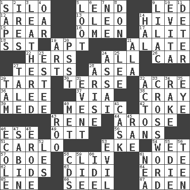 ACROSS 1. Grain storage tower 5. Grant temporary use of 9. Directed 12. Type of rug 13. Butter sub 14. Hub of activity 15. Lightbulb-shaped fruit 16. Sign of something about to happen 17. Set down 18. Fast jet (abbr.) 19. Fitting 21. Having winglike extensions 22. Possessive pronoun 24. 100% 26. Automobile 27. Trials 28. Toward the sea 29. Small pie 30. Laconic 32. Land measure 36. Toward shelter 37. By way of 38. Supercomputer manufacturer 39. Ancient Persian 40. Mesonic 42. Puff or smoke 43. French philosopher Descartes 44. Came up 46. Compass dir. 49. Baseball player Mel 50. Without 51. Monte _, Las Vegas Hotel/Casino 53. Supplement with great effort 54. Dripping 57. Mitch Miller's instrument 58. 154 in Roman numerals 61. Connecting point 62. Flaplike coverings 63. "You Light Up My Life" star Conn 64. One of the Great Lakes 65. Compass dir. 66. Sew up the eyelids of hawks and falcons 67. An important port of Yemen DOWN 1. Plant excrements 2. Angers 3. Resembling or made to resemble leather 4. Boat paddle 5. Plunder 6. Shade tree 7. Born 8. Spanish title 9. Pale purple color 10. Webber/Rice musical 11. Prevent from occurring 14. Actor Linden 19. Nonscientific branch of learning 20. Inconspicuous attention getter 21. In the manner of 23. First name in cosmetics 24. Slender Brazilian palm 25. Area sheltered from the wind 27. Falsehood 28. Get up 29. Scottish cap 31. Incident 32. 13-14th century defensive garment 33. What you're doing now 34. Libertine 35. Sight organ 40. Was introduced to 41. Keg 43. Friend of Pooh 45. Actress Charlotte 46. Learning spot: Fr. 47. Unit of acoustic absorption 48. Eat (away) 52. French article 53. Morally bad or wrong 55. Singer Brickell 56. Adolescent 58. Music discs 59. Whopper 60. Binary compound 61. Teachers' org.