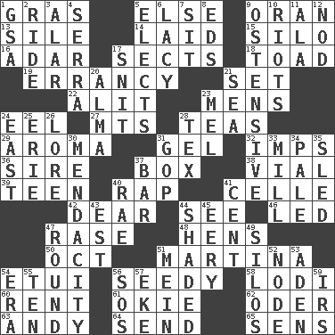 ACROSS 1. Pate de foie ____ 5. Otherwise 9. NW Algerian seaport 13. Filth; sediment 14. Put down 15. Grain storage tower 16. The sixth month of the Jewish calendar 17. Religious groups 18. Frog relative 19. Tendancy to err 21. Put into a specified state 22. Came down and settled, as after flight 23. Not women's 24. Snakelike fish 27. Mountains (abbr.) 28. Beverages made from leaves 29. Scent 31. Set 32. Naughty children 36. Beget 37. Gift holder 38. Small bottle 39. Adolescent 40. Hit sharply and swiftly 41. Cell (Danish) 42. Letter starter 44. Observe 46. Directed 47. Raze (variant) 48. Coop moms 50. Sep. follower 51. Chrissie's court nemesis 54. Needle holder 56. Shabby and untidy 58. Farming town in central California 60. Monthly bill 61. Migrant worker of the '30s 62. River in Europe 63. "60 Minutes" Commentator Rooney 64. Transmit 65. Elected reps. DOWN 1. Girls' org. (abbr.) 2. Travel on or in a vehicle 3. Having or resembling wings 4. Father Junipero _ 5. Opts 6. Made of lace 7. Be seated 8. Begley and Asner 9. Clearly or manifestly demonstrative 10. Debaucheries 11. According to 12. Allow head to fall sleepily 17. In a ____ (agitated or irritated) 20. _ mater 21. Ocean 23. Cartoonist voice _ Blanc 24. 90 degrees 25. 4th largest of the Great Lakes 26. Old wives' tales, e.g. 28. John Ritter's dad 30. Ananias' fault 31. Republican Party 33. Place where flour is made 34. Light colored 35. Downhill vehicle 37. Soap unit 40. Actress Charlotte 41. Penny 43. Eastern Standard Time (abbr.) 44. Cast a shadow over 45. Suggestive of the supernatural 47. Having a circular shape 49. Grain storage towers 51. Count _ (2 wds.) 52. Connecting point 53. Arabian gulf 54. Epoch 55. Nine, plus one 56. Mayday 57. Supplement with great effort 59. Big collection agency