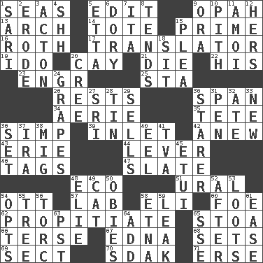 ACROSS 1. Oceans 5. Prepare for publication 9. Brightly colored fish 13. Bowlike part 14. Haul 15. A-one 16. Writer of Portnoy's Complaint (1969) 17. Interpreter 19. Wedding promise 20. Island 21. Expire 22. Part of HMS, perhaps 23. Engineer (abbr.) 25. R.R. building 26. Musical pauses 30. Connect, as a bridge 34. Nest on high 35. Wig 36. Simple or foolish person 39. An arm off of a larger body of water 42. Afresh 43. One of the Great Lakes 44. Prying instrument 46. Labels 47. Chalkboard 48. Environmental prefix 51. Mountain range 54. Baseball player Mel 57. Experiment locale 58. Biblical high priest 60. Enemy 62. Appease 65. Portico 66. Laconic 67. Pulitzer Prize-winning author Ferber 68. Arranges properly for use 69. Religious group 70. Neighbor of Neb. 71. Celtic language DOWN 1. Indian skirt 2. Wear away 3. NE Massachussets city 4. Quiet! 5. Singer James 6. Small, narrow, flatbottom fishing boat 7. Call ___ day 8. Looks after 9. Mouth or opening 10. Essential or central part 11. Mine, in Marseilles 12. Possessive pronoun 15. Entreaty 18. Be seated 20. Algonquian 24. Raisin fruits 27. _ Lanka 28. Shallow baking pan 29. Makes a sale 30. A viewer who gazes fixedly 31. Fenced enclosure 32. Had dinner 33. ___ Haven, CT 36. Put into a specified state 37. Retirement account (abbr.) 38. Russian fighter aircraft 40. Snakelike fish 41. Federal power corp. 45. Needle case 48. Writer Wiesel 49. Domesticated feline 50. Off-Broadway awards 52. Following 53. Plunders 54. Chooses 55. Woody plant 56. Torque (variant) 58. Inactive volcano in Sicily 59. Path through which fluid escapes 61. Comfort 63. Pacific Standard Time (abbr.) 64. Find the sum of 65. Compass dir.