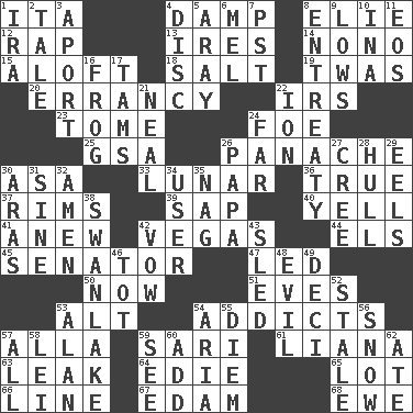 ACROSS 1. Call ___ day 4. Moist 8. Writer Wiesel 12. Hit sharply and swiftly 13. Angers 14. Words to Nanette 15. High up in or into the air 18. Table seasoning 19. It was, poetically 20. The state or an instance of erring 22. Big collection agency 23. Heavy book 24. Enemy 25. Girls' org. (abbr.) 26. Flamboyance 30. White ___ sheet 33. Type of eclipse 36. Loyal 37. Basketball hoops 39. Plant excrement 40. Shout 41. Afresh 42. Viva Las _ 44. Raised railways 45. Elected representative 47. Directed 50. Immediately 51. Nights before holidays 53. Keyboard modifier key 54. Inveterate users 57. Silent film actress Nazimova 59. Indian skirt 61. Woody, climbing, usually tropical plant 63. Path through which fluid escapes 64. Singer Brickell 65. Car dealer's back yard 66. Actor's bit 67. Dutch treat 68. She-sheep DOWN 1. Retirement account (abbr.) 2. Story 3. To the left, to Queeg 4. Flat circle 5. Like ___ of sunshine 6. Cartoonist voice _ Blanc 7. Pacific Standard Time (abbr.) 8. Plea 9. Coldest temperatures 10. _ tizzy (2 wds.) 11. Greek goddess of the dawn 16. Tree-dwelling hopper 17. Scottish caps 21. Be tempered by heat 22. Electrically charged atom 24. At a great distance 26. Dad 27. Algonquian 28. Frame or body of a ship 29. Snakelike fish 30. Caspian sea tributary 31. Trig term 32. So be it 34. One who uses or employs something 35. Tired old horse 38. Tchaikovsky ballet 42. Promise 43. Downhill vehicle 46. Small child 48. Tending to cause great harm 49. Tenth: prefix 52. Showing deterioration from age 53. Actor Alda or Thicke 54. Operatic vocal solo 55. South Vietnam president (1954) 56. Frozen precipitation 57. Everything 58. Luau accessory 59. Observe 60. Increase 62. Had dinner