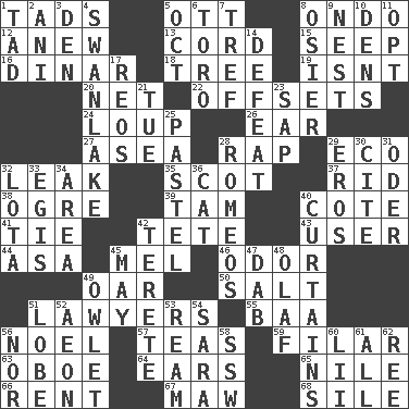 ACROSS 1. Bits 5. Baseball player Mel 8. Southwest Nigerian state 12. Afresh 13. Drawstring 15. Ooze 16. Middle Eastern gold or silver currency 18. Woody plant 19. Is not 20. Fish or hair follower 22. Compensates for 24. Central Nebraska county 26. Hearing organ 27. Toward the sea 28. Hit sharply and swiftly 29. Environmental prefix 32. Path through which fluid escapes 35. Native of Scotland 37. To free from 38. Legendary monster 39. Scottish cap 40. ____ d'Azur (French Riviera) 41. Neckwear 42. Wig 43. One who uses or employs something 44. White ___ sheet 45. Cartoonist voice _ Blanc 46. Scent 49. Rowing implement 50. Table seasoning 51. Those who practice law 55. Sound made by sheep 56. Christmas carol 57. Afternoon social gatherings 59. Of or pertaining to a thread or threads 63. Mitch Miller's instrument 64. Hearing organs 65. "Death on the ____" 66. Monthly bill 67. Opening into something insatiable 68. Filth; sediment DOWN 1. Small amount or degree 2. Black tropical American cuckoo 3. Lair 4. Tchaikovsky ballet 5. Sep. follower 6. "Corrida" creature 7. Unclean, religiously 8. Flexible twig of a willow tree 9. A home for chicks 10. Hiding places for outlaws 11. Elect 14. Outscore 17. Vintage cars 21. Third day of the wk. 23. Plant excrement 25. Soft color 28. Lover boys 29. Greek god of love 30. Quote 31. River in Europe 32. Globular water bottle used in Asia 33. The front part of a cuirass 34. Type of rug 36. Feline 40. Window treatments 42. Cylindrical with tapered ends 45. Can I? 47. Apply (a substance) by light strokes 48. Norwegian king 49. A small or young owl 51. Ear part 52. A really long time 53. 480, 500 or 516 sheets of paper 54. "Two Mules for Sister ____" 56. Or not 58. Compass dir. 60. Cards in a Roman deck? 61. 100% 62. To separate or throw off