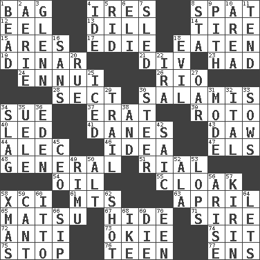 ACROSS 1. Paper or plastic container 4. Angers 8. Argument over a trivial matter 12. Snakelike fish 13. Deli pickle 14. Become fatigued 15. Ancient Greek god of war 17. Singer Brickell 18. Ingested 19. Middle Eastern gold or silver currency 21. HTML Container Element 23. Possessed 24. World-weariness 26. _ de Janeiro 28. Religious group 30. Deli grouping 34. Institute legal proceedings 37. Part of Q.E.F. 39. Printing process, for short 40. Directed 41. Natives or inhabitants of Denmark 43. Fool 44. Actor Baldwin 46. It may be bright or harebrained 47. Raised railways 48. Commissioned military rank 51. Monetary unit of Yemen 54. Petroleum 55. Covering 58. One more than ninety 61. Mountains (abbr.) 63. Showery time 65. Taiwanese island in East China Sea 67. Flintstone garb 71. Father 72. Against 73. Migrant worker of the '30s 74. Be seated 75. Close up, plug up 76. Adolescent 77. Followers of ems DOWN 1. Necklace unit 2. Nest on high 3. American astronaut and politician John 4. Binary compound 5. To free from 6. Connecticut Ivy Leaguer 7. Downhill vehicle 8. R.R. building 9. Essential or central part 10. Type of rug 11. Watch over 16. Without 18. Tending to cause great harm 20. Regret 22. Lyricist Gershwin 25. On the rocks 27. Boat paddle 29. Drop behind 30. Guide 31. Method 32. Slanted text style (abbr.) 33. Sty mamas 34. Volcanic refuse 35. Ubangi River tributary 36. Locale of original sin 38. Plus 42. Ketch in the Levant 45. Corporate head (abbr.) 49. Tall New Zealand timber tree 50. Keyboard modifier key 52. Chicken ___ king 53. Chops off 56. Get up 57. Japanese brewing company 58. Dec. holiday 59. Patter 60. "Tell ____ the Marines!" 62. Opportunity 64. Allows 66. Small drink 68. D.D.E's nickname 69. Expire 70. Car or cant ending
