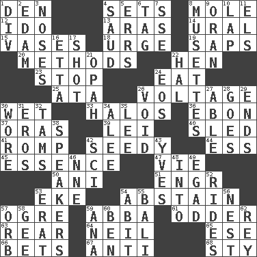 ACROSS 1. Lair 4. Puts into a specified state 8. Undercover agent 12. Wedding promise 13. Ancient river in northeast Turkey 14. Mountain range 15. Flower holders 18. Goad 19. Plant excrements 20. Modes 22. Layer 23. Halt 24. Ingest 25. _ moment's notice (2 wds.) 26. Electrical Measurement 30. Dripping 33. Auras 36. Inky black, to poets 37. Mouths or openings 39. Luau accessory 40. Downhill vehicle 41. Play 42. Full of seeds 44. Double-curved letter 45. Center 47. Compete 50. Cuckoo 51. Engineer (abbr.) 53. Make supply last 54. Choose not to consume 57. Legendary monster 59. Swedish rock group 61. More peculiar 63. Located in or toward the back 64. Famous astronaut Armstrong 65. Compass dir. 66. Antes 67. Opposed to 68. Filthy place DOWN 1. HTML Container Element 2. Dutch treat 3. Olfactory organs 4. Saudi Arabian king (1953-1964) 5. Blunders 6. Label 7. Compass dir. 8. French bagpipes 9. NW Algerian seaport 10. Infant locale 11. Raised railways 16. Singer James 17. Attempt 21. Brightly colored fish 22. Actor Linden 24. Greek goddess of the dawn 26. Lacking any legal or binding force 27. Competent 28. Moves 29. Conclusions 30. Had on 31. Greek god of love 32. Scottish caps 34. Toward shelter 35. Area sheltered from the wind 38. Orators 42. _-fi 43. Jacques Cousteau's middle name 46. Compass dir. 48. To the inside or interior of 49. Mild oath 52. Amusement-park features 53. Part of Q.E.F. 54. "This won't hurt ____!" 55. Indonesian resort city 56. A home for chicks 57. Globe 58. Turn to the right 59. Santa ___, CA 60. Benjamin's nick name 62. Marina Del _, California