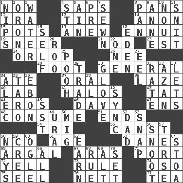 ACROSS 1. At this time 4. Plant excrements 8. Baking dishes 12. Lyricist Gershwin 13. Become fatigued 14. Soon (poet.) 15. Cooking vessels 17. Afresh 18. World-weariness 19. Contemptuous expression 21. Dreamland 23. Eastern Standard Time (abbr.) 24. Lowest deck of a ship 26. Born 28. Pick up the tab 30. Commissioned military rank 34. Had dinner 37. Relating to the mouth 39. Goldbrick 40. Experiment locale 41. Radiant circles of light 43. Make lace 44. Greek god of love 46. _ Jones' Locker 47. Followers of ems 48. Eat 51. Conclusions 54. Three (prefix) 55. 2nd pers. sing. pres. of can (arch.) 58. Non-commissioned officer (abbr.) 61. Personal question 63. Natives or inhabitants of Denmark 65. Therefore, facetiously 67. Caspian sea tributary 71. Sweet dark-red dessert wine 72. Shout 73. Governing power 74. Bear (Spanish) 75. Sew up the eyelids of hawks and falcons 76. Remaining after all deductions 77. Afternoon social gathering DOWN 1. Pinches, bites 2. U. of Maine site 3. Wetness 4. R.R. building 5. The 18th letter of the Arabic alphabet 6. Before (prefix) 7. Stitched 8. Baking dish 9. Queen of England 1702-14 10. Common sense 11. In a ____ (agitated or irritated) 16. Oneself 18. Locale of original sin 20. Friend of Pooh 22. Single 25. "Silly old bear" 27. Snakelike fish 29. Swap 30. Michael Jackson trademark 31. Assign a rank or rating to 32. Muslim summons to prayer 33. Allows 34. Actor Baldwin 35. Edible starchy tuberous root 36. Inky black, to poets 38. In the manner of 42. Synchronize (abbr.) 45. Fast jet (abbr.) 49. Mountain range 50. Russian fighter aircraft 52. Male parent 53. Fastener 56. Snob 57. Laconic 58. Negative votes 59. Algonquian 60. Stare at amorously 62. Merit 64. Portico 66. Everything 68. Sorrow 69. The first octave above the treble staff 70. Put into a specified state
