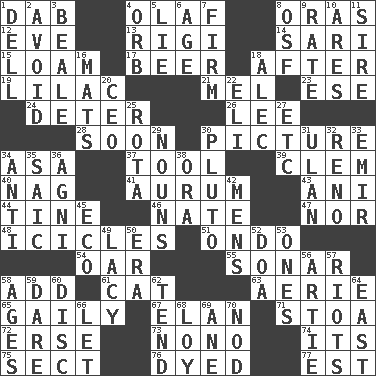 ACROSS 1. Apply (a substance) by light strokes 4. Norwegian king 8. Mouths or openings 12. First lady 13. Swiss mountan, "Queen of the Mountains" 14. Indian skirt 15. Rich soil 17. Fermented drink made from hops 18. Following 19. Pale purple color 21. Cartoonist voice _ Blanc 23. Compass dir. 24. Prevent from occurring 26. Area sheltered from the wind 28. Within a short period 30. Photo 34. White ___ sheet 37. Utensil 39. Clement's nick name 40. Tired old horse 41. Gold (Symbol: Au) 43. Black tropical American cuckoo 44. Prong on a fork 46. Nathan's nickname 47. Or not 48. Winter's stalactites 51. Southwest Nigerian state 54. Rowing implement 55. Echolocation 58. Say or write further 61. Domesticated feline 63. Nest on high 65. Lightheartedly 67. Style 71. Portico 72. Celtic language 73. Words to Nanette 74. It is 75. Religious group 76. Colored 77. Eastern Standard Time (abbr.) DOWN 1. Small valley 2. Prevent from happening 3. Calif. Air Force Base 4. Globe 5. Whopper 6. Mature 7. Become taut 8. Order of Saint Francis (abbr.) 9. Pace 10. Ancient Greek god of war 11. Father 16. Floor coverings 18. Actor Baldwin 20. Corporate head (abbr.) 22. Connecticut Ivy Leaguer 25. Roll call or roster of names 27. And so on (abbr.) 29. Parts of speech 30. Cartoon dog 31. ____ Bator 32. Western Nevada city 33. Independent ruler or chieftain 34. Opposed to 35. Ketch in the Levant 36. Hindu god of fire 38. Mouth or opening 42. Not women's 45. Environmental prefix 49. Made of lace 50. Period 52. ___ good deed 53. Washington bills 56. Nick name for Arthur 57. Debaucheries 58. Grows older 59. Have the gumption 60. Plate 62. Be inclined (to) 64. Compass direction 66. Allow 68. Myrna of the movies 69. A saturated hydrocarbon 70. Allow head to fall sleepily