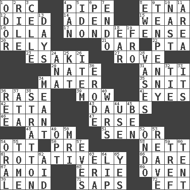 ACROSS 1. The grampus (Milton) 4. Corncob 8. Inactive volcano in Sicily 12. Passed on 14. An important port of Yemen 15. Put on (as clothing) 16. Spanish pot 17. Unrelated to defense, as in spending 20. Depend 21. Boat paddle 22. Parent Teacher Assoc. 23. 1973 Nobel Price Winner (Physics) Leo 27. Be footloose 29. Nathan's nickname 31. Opposed to 34. Mother 35. In a ____ (agitated or irritated) 36. Raze (variant) 39. Cut the grass 41. Sight organs 42. Singer James 43. Applies to a surface 46. Merit 47. Celtic language 48. Smallest unit of an element 51. Sir (Sp.) 54. Baseball player Mel 56. Before (prefix) 58. Remaining after all deductions 61. Producing rotation 66. Have the gumption 67. Mine, in Marseilles 68. 4th largest of the Great Lakes 69. Baking chamber 70. Grant temporary use of 71. Plant excrements 72. Lizard (obsolete) DOWN 1. Scent 2. Cause heat under the collar 3. Cell (Danish) 4. Baking dish 5. Wedding promise 6. Writing instrument 7. Inside; within (prefix) 8. She-sheep 9. 3-inch nail 10. Political cartoonist Thomas 11. Length times width 13. 24-hour periods 18. Hearing organ 19. Away 24. Santa ___, CA 25. Krazy ___ of comics 26. A whole individual unit 28. Flower holders 30. Wear away 32. Make a knot 33. It is 34. Intended 36. To sift 37. "One Day ___ Time" 38. Ski resort town in Vermont 40. Armed conflicts 44. Purpose 45. Benjamin's nick name 49. Elect 50. Medical imaging device (abbr.) 52. Southwest Nigerian state 53. Rob, plunder, or pillage 54. Relating to the mouth 55. Heavy book 57. Nights before holidays 59. Unclean, religiously 60. Portable shelter 62. Assist 63. Period 64. Mouth edge 65. Affirmative reply