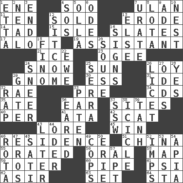 ACROSS 1. Compass dir. 4. "Barney Miller" actor Jack 7. ____ Bator 11. Nine, plus one 12. Disposed of to a purchaser 13. Wear away 14. Small amount or degree 15. Capri or Wright 16. Chalkboards 17. At or to great height 19. Aide 21. Frozen water 23. Double curve, resembling the letter S 24. Frozen precipitation 25. Player for Phoenix 26. Myrna of the movies 29. Dwarf 30. Double-curved letter 31. Binary compound 32. Actress Charlotte 33. Before (prefix) 34. Music discs 35. Had dinner 36. Ewer handle 37. Settings 40. For each 41. "One Day ___ Time" 42. Jazz singing style 43. Old wives' tales, e.g. 45. Acquire through effort 46. Dwelling 51. Large country 55. Declaimed 56. Spoken 58. Atlas unit 59. Carrier 60. Corncob 61. 23rd letter of the Greek alphabet 62. SW Saudi Arabia district 63. Put into a specified state 64. R.R. building DOWN 1. Singer James 2. Anneal 3. Inside; within (prefix) 4. Distress signal 5. Water jar 6. Lyric poems 7. A salt of uric acid 8. Globular water bottle used in Asia 9. Arabian gulf 10. Egg locale 12. "Cheers" or "Ellen" 13. Otherwise 16. Attaches a signature 18. Fine (Spanish) 20. Boozer 22. She-sheep 24. Contemptuous expression 25. Spanish missionary in California 26. It is permitted: Lat. 27. Probability 28. Consenting reply 29. Yard entry 32. Hit sharply and swiftly 33. Eucharist need 36. Having ears or earlike features 37. Compass dir. 38. Hanging ice 39. Hyperbolic tangent 43. 61 cubic inches 44. River in Europe 46. Roll call or roster of names 47. Greek god of love 48. Suttee (variant) 49. 911 reaches them 50. 4th largest of the Great Lakes 52. Naughty children 53. Political cartoonist Thomas 54. Capital of Western Samoa 57. Fitting