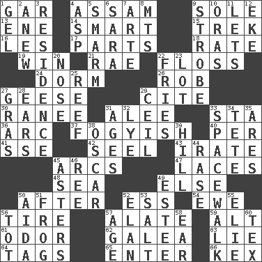 ACROSS 1. Slender fish 4. Indian state 9. Not divided or shared with others 13. Compass dir. 14. Don Adams' spy role 15. Long journey 16. French article 17. Pieces 18. Pace 19. Victory 21. Actress Charlotte 22. Soft thread for cleaning between teeth 24. Dormintory (informal) 26. Director Reiner 27. Honkers 29. Quote 30. Indian princess (variant) 31. Toward shelter 33. R.R. building 36. Curve 37. Out of fashion; old fashioned 40. For each 41. Compass dir. 42. Stitch closed the eyes of (a falcon) 43. Feeling or showing extreme anger 45. Arches 47. Shoestrings 48. Ocean 49. Otherwise 50. Following 52. Double-curved letter 54. She-sheep 56. Hoop that covers a wheel 57. Having winglike extensions 59. Keyboard modifier key 61. Aroma 62. An organ shaped like a helmet 63. Whopper 64. Labels 65. Keyboard key 66. Dry husk or covering DOWN 1. Set 2. Afresh 3. Home 4. Cleo's killer 5. Excessive but superficial compliments 6. "Two Mules for Sister ____" 7. Johnson of "Laugh-In" 8. Mountains (abbr.) 9. Disco prop 10. Mouths or openings 11. Allows 12. Supplement with great effort 20. Characteristic smell of wine 22. Strips of potato fried in deep fat 23. Car dealer's back yard 25. Coral collection 27. Pate de foie ____ 28. Hearing organs 29. To provide with a ceiling 31. Eras 32. Potassium hydroxide 33. High altitude stroll 34. Wig 35. Ancient Greek god of war 38. Witty Wilde 39. Land elevation 44. Raze (variant) 45. Michaelmas daisies 46. Portuguese money of account (variant) 49. First name in cosmetics 50. Opera by Verdi 51. Tree-dwelling hopper 52. Enthusiasm 53. Table seasoning 55. Writer Wiesel 56. Small child 57. Grow older 58. Ewer handle 60. John Ritter's dad