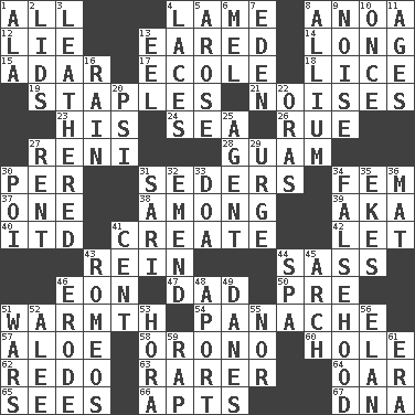ACROSS 1. Everything 4. Unable to walk 8. Small Philippine buffalo 12. Falsehood 13. Having ears or earlike features 14. Protracted 15. The sixth month of the Jewish calendar 17. Learning spot: Fr. 18. Louse (plural) 19. Paper fasteners 21. Annoying sounds 23. Part of HMS, perhaps 24. Ocean 26. Regret 27. Painter Guido (1575-1642) 28. Island territory of the United States 30. For each 31. Spring feasts 34. Opposite of masc. 37. Single 38. Amid 39. Alias (abbr.) 40. It would 41. Make 42. Allow 43. It's straight from the horse's mouth 44. Backtalk 46. A really long time 47. June honoree 50. Before (prefix) 51. Heat 54. Flamboyance 57. Medicinal plant 58. U. of Maine site 60. Opening into or through something 62. Do over again 63. More valued for its uncommonness 64. Rowing implement 65. Perceives with the eye 66. Tenement units (abbr.) 67. Heredity factor (abbr.) DOWN 1. Chicken ___ king 2. Hats (slang) 3. Resembling or made to resemble leather 4. Shoestrings 5. Came up 6. Cartoonist voice _ Blanc 7. Locale of original sin 8. Plant genus of onion and garlic 9. Annoying sound 10. At one time in the past 11. Eras 13. Snakelike fish 16. Water falling in drops from the sky 20. 23rd letter of the Greek alphabet 22. Mouths or openings 25. Rep 27. Monthly bill 29. Goad 30. Luau course 31. Indian skirt 32. Make improvements or corrections to 33. ___ good deed 34. It jiggles the polygraph 35. Makes supply last 36. Floor protector 41. Penny 43. Lover boys 44. Health resort 45. Bowlike part 46. Eat (away) 48. To the left, to Queeg 49. Natives or inhabitants of Denmark 51. Armed conflicts 52. Toward shelter 53. Israeli folk dance 55. Or not 56. Flair 59. Reproach for some lapse or misdeed 61. Epoch